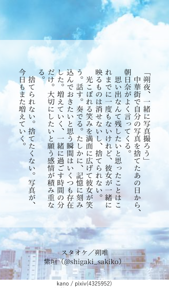 紫垣🐠☆quiet followDONEスタオケ/朔唯 写真の話12/15 エアコレで新刊をお申込みいただいた方に先着でおまけにお付けしていたものです。 #スタオケ #朔唯 sowei Tap to full screen (size:550x950).Repost is prohibited Let's send reactions! freqpopularsnackothersPayment processing Replies from the creator Follow creator you care about!☆quiet follow 紫垣🐠DONE笹仁/星空のアクアリウムOP.3 展示作品スタオケ加入後の二人のお話。ナチュラルに付き合ってます。※R18はつけていないですが、行為が匂わされる表現があったり、甘めだったりするので苦手な方はご注意ください。『GRADATIONS』>#0「Colorless Color」#1,#2「Colored Notes」#3「like a FISH in water」から続いている連作です。 6778 紫垣🐠DONE笹仁/星空のアクアリウムOP.3 展示作品スタオケ加入後の二人のお話。ナチュラルに付き合ってます。※コンミス出ます『GRADATIONS』>#0「Colorless Color」#1,#2「Colored Notes」から続いている連作です。#4「One Identity」に続きます。 5686 紫垣🐠DONE笹仁/星空のアクアリウムOP.2 展示作品スタオケ加入後の二人のお話。ナチュラルに付き合ってます。※コンミス出ます後日談は近日中に公開予定です。『GRADATIONS』#0「Colorless Color」から続いています。「like a FISH in water」に続きます。 11556 紫垣🐠DONE笹仁/星空のアクアリウムOP.2 展示作品本編前(ねつ造)笹塚くんが仁科くんの音に初めて出会った日の話『GRADATIONS』(5編連作)#1『Colored Notes』に続きます…! 2847 紫垣🐠DONE笹仁8章後横浜にて。CP要素は薄めですがナチュラルに付き合ってます。※仁科さんがスタオケのセカンドトップの設定です 9098 紫垣🐠DONEあさよふ後夜祭(ワンドロ)作品。 テーマ:『お祝い』毎日が小さなお祝いの積み重ね。スタート遅刻の0.5ドロくらい。 2 related works amururunkoDONE浮唯です。付き合っていませんが、浮葉にとって唯は最初からかなり特別な人間だったろうと思います。華やいで絢爛、開催おめでとうございます!! 10 はな-hana-DONE7月31日は『🎵蓄音機の日🎵』成宮くんと唯ちゃん。蓄音機と喫茶店いいな〜というのと、喫茶店にエプロンの成宮くんを見たくて😊レコードとかも詳しそうな気がする〜🥳 ramnim らむDOODLE常陽サンド(*´༥`*)ウマウマ Nightingale0616MEMO【巽瑛一に理性を吹っ飛ばされた当方の雑記】懐かしいのでUPしてみました。はしゃいでいるようですが、その後4話を読んでショックで寝込みます。笑初出・20220324(初開催マドリガル最終日) 3 kanra_e1ghtDOODLE成唯 スズマルDOODLE怜唯を探せ ともそDOODLE三上蒼司くん 枢木ひかりDOODLE skyapricotSPOILER【スタオケ】メイン3章や朔夜SSRカードストやデートストバレ有 recommended works うめ@眠いDOODLE #スタマイ 2 mnm_0010_kiDONE #スタマイソーサラー早乙女さんの逆光Ver.笑 小夜の倉庫DONE「君に夢中」(渡玲)/2018.1.3お友達のリクエスト&渡部本編読了記念に。 jun_horai0111swDONE支部に上げた渡部さんBDの続きになるSS 4 hino_stmyDONE大谷羽鳥(→玲)不誠実な表現があります。幸せでもありません。 3 かなかなTRAINING蒼玲『給料3ヶ月分の、』 2 小夜の倉庫DONE「教えて、お姉さん」(カナ玲)/2018.6.2リクエストで書きました。キスがテーマ。 結城ぱんだMAIKINGたったそれだけなのに。/カナ玲続き書けたらいいね(希望的観測) 2 syumiaka1123TRAINING下書き。和服よーさん