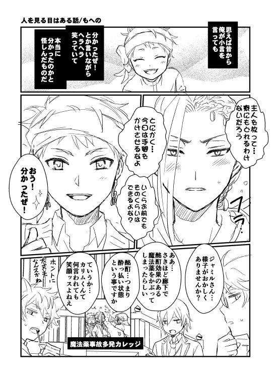 うたオア2開催おめでとうございます!新しい展示のページ数が予定より増えてしまって間に合いそうにないので未完成ですが進捗1枚だけ賑やかしに置いておきます。丸文字で喋るジャミルくん楽しかったんですが読みにくいですね///時間内に出来たらもう一枚置きにくるかもしれません。ジャミカリ万歳🎊🙌