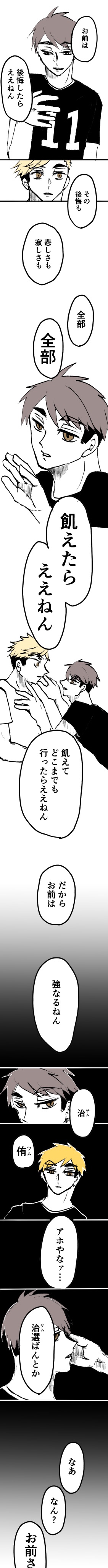 小説を拝読して、幕間の時の侑と治の会話が浮かんだのと、その後で二人がもし足掻くのを許されたのなら、特異点となり現実で選んだ二人に影響を与えて未来変えてしまうんじゃないかなあという妄想が続いたものになります。