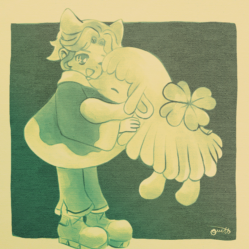 モモスはよつ葉のクローバーの実を見つけた。本物より大きめで少し葉っぱが厚い。モモスにあげたくて探していたら、モモスが嬉しそうに背中に乗せて持ってきた。思わずお鼻を抱きしめる……。