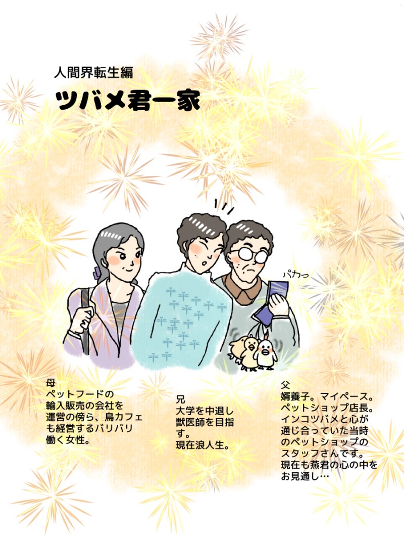 ツバメ君のお父さんの姿は、インコツバメが転生する時、心の奥底で「この人の息子になりたい…」と願った、彼の運命を変えてくれた若いショップスタッフさんなのです。