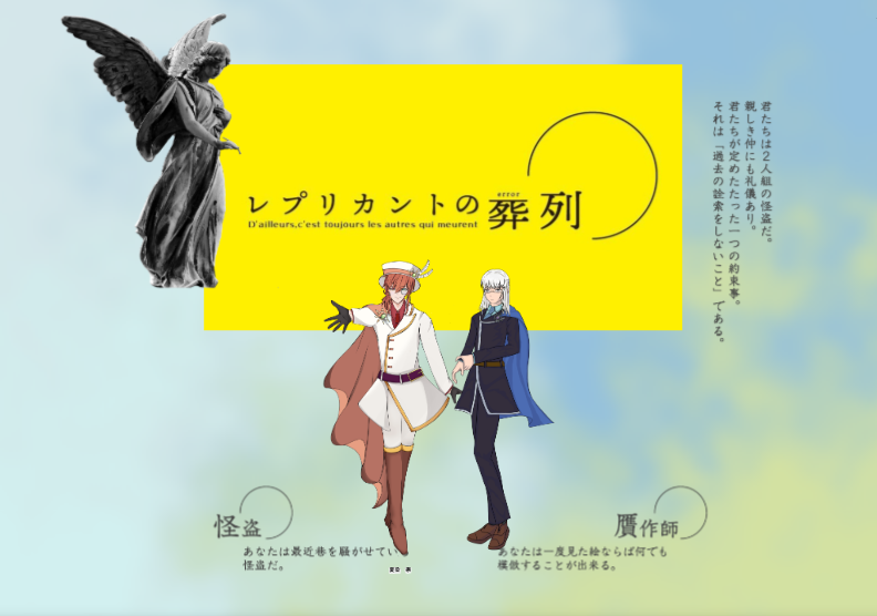 slt_trpg☆quiet followMEMOクトゥルフ神話TRPG 6版【レプリカントの葬列】◯助様KP:そるHO怪盗:ことりさんHO贋作師:トーマさんエンドAにてシナリオクリアお疲れ様でした! Tap to full screen (size:792x556).Repost is prohibited Let's send reactions! freqpopularsnackothersPayment processing Replies from the creator Follow creator you care about!☆quiet follow slt_trpgMEMOクトゥルフ神話TRPG【塔葬の国】KP:叶音さんPL:ももんぬさん、インディゴさん、そるエンドAにてシナリオクリアすげーシナリオだった!!2枚目はKP叶音さんが描いてくれたエンドカードですありがとうございます!! 2 slt_trpgMEMOクトゥルフ神話TRPG 6版【レプリカントの葬列】◯助様KP:そるHO怪盗:ことりさんHO贋作師:トーマさんエンドAにてシナリオクリアお疲れ様でした! slt_trpgPROGRESSござ 4 slt_trpgDOODLE自陣用 3 slt_trpgDOODLE 3 slt_trpgDOODLEごだるか ⚠️ネタバレあり追加差分とおあそび 5 recommended works ScolopendraDOODLEAether x LumineHumping clarithromycinDOODLE うさぎさんDONECoC第六版『人類よ!』好奇心旺盛無邪気キッズのガヴローシュ。人懐っこくいろいろなものに興味を抱きやすいお年頃。面白いものがあればなんでも勢いで突っ走ってしまう危ないところがある。 2 みずななDOODLE※R-18 夏英 ShititO_SS10SPOILER鰯と柊 現行未通過❌️ HO柊:終儺の立ち絵 7 liomshchun61593DONEさよエン後 初夜編初夜は何回あってもいいよね 5037 こもゐDOODLE一応というかnmmn注意🐕と🕶️こういうのチョケでいいから見たいや…こういうキモオタが基準で描いてる時が一番上手く描けるのなんだろう 霧(きり)TRAINING声高い印象強い choice9625MENUクトゥルフ神話TRPG「伍戒」作:ぽるんが様KP スナさんHO1 一条 鈴風/暇猫さんHO2 宮原 桜華/YuriHO3 杢木 陽楼/クロネコHO4 芥屋 赤羽/TETOさん
