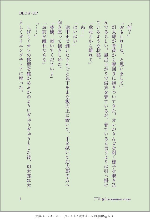 discomunication☆quiet followDONE寝ぼけてる幻太郎と世話焼き帝統の帝幻特に何も起こらないダラダラしたお話7p 以前書いた中華丼の話↓と同じ世界線のつもりhttps://poipiku.com/170930/6221678.html #帝幻 imperialFantasy show all(+6 images) Tap to full screen (size:630x928).Repost is prohibited Let's send reactions! freqpopularsnackothersPayment processing Replies from the creator Follow creator you care about!☆quiet follow discomunicationDONEpass→R18? y/n帝幻のねったいや〜♪を想像したら耐え難きえっちさだったので一旦出力しました🔥やるべき原稿が進まない!! 3 discomunicationREHABILI何も始まってない帝+幻 洗われる駄目太郎どっかで見たことありすぎるな……と思ったけど画像にしちゃったので供養でおいときます 3 discomunicationMEMO犯探本の時に無配にしていたメモです discomunicationREHABILI薄暗い文章。6頁帝→幻ちょいセンシティブ 6 discomunicationMOURNING⚠︎乱数の体調治ってないクローン狩りの匂わせちょっと怖いぽっせ 3 discomunicationDONE炎人祭追加🔥同居していたけどはっきりしてなかった二人です。モブ女とリオの絡み注意です 3 related works 真夜中のすいか🍉MAIKING長編予定の話の一章部分(全17ページ予定)出来た分だけ随時追加中。付き合ってないけどなんか拗れてる帝幻🎲📚書くとネタバレになるので具体的には言えませんが、色々注意です…。▼最終更新●3/11 17ページまで追加(一章完成しました!) 17 ぺらしPAST10分漫画シリーズ帝幻さん「絵がほんとにきたない」 8 yu_mg000DONE【サマフェス展示漫画】付き合ってる帝幻(玩具使用表現あり)※高校生以下の閲覧禁止 6 ramugendaiDOODLER18の帝幻ラクガキ、描きたいとこだけですパスワード18才(高卒)以上ですか? 4 きちきちばんばんDOODLE盗賊の顔隠してる布外して、お前めっちゃくちゃキレーだな!って屈託無く笑ってくれ…()Stella王様×盗賊 帝幻 yuzukichi5DONE帝幻フェス無配。現在付き合ってる帝幻。幻太郎が過去に一雨と体の関係があった設定です。軽い事後シーンあり。 8 304_microDOODLE #帝幻 #ヒプマイ R_mmarblecDONEさまふぇす2用無配。開催おめでとうございます! 7 きちきちばんばんDOODLE猫だいげん