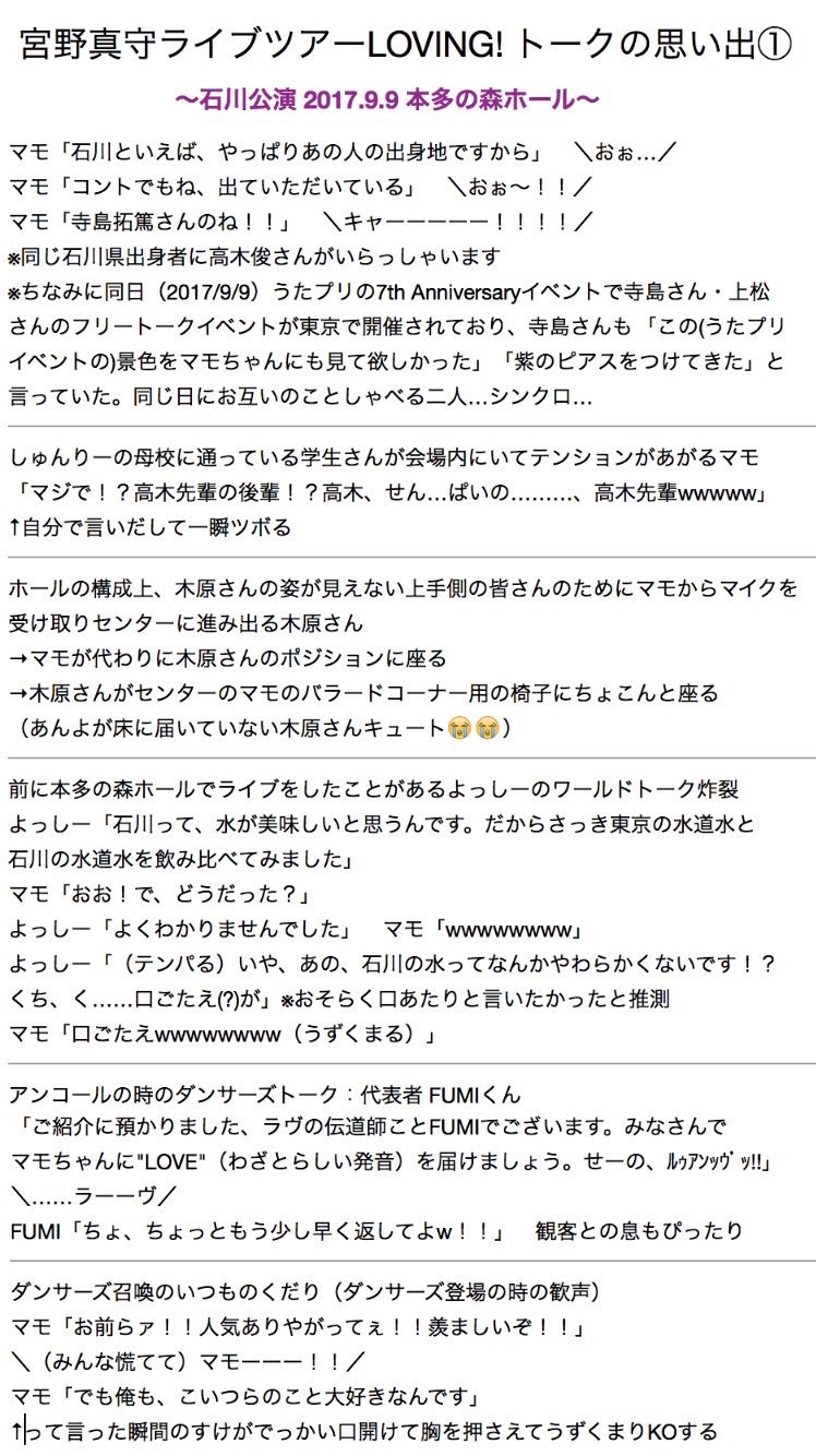 oskn_js☆quiet followDONE参加した公演のLOVING!フリートークのメモ。 ##レポ show all(+7 images) Tap to full screen (size:748x1334).Repost is prohibited oskn_jsDOODLEあけましておめでとうございます。子年もよろしくおねがいします。 oskn_jsDOODLEこれは2019年の1年間アイコンにしていたイノシシ男 oskn_jsDOODLEこれはおげんさんといっしょ第3回目が放送された時に描いたやつ oskn_jsMAIKING oskn_jsDOODLE2019.12.10 WSS Season1アフタートークショー”TOBIの部屋”のメモ。司会のTOBIさんと、宮野さん、笹本さん、樋口さん。15分ほどのトークだったけれど、色んなお話が聞けて楽しかった〜! 4 oskn_jsDOODLEぴんぽん recommended works oskn_jsDONE2017.3.12 カルライ1st Liveまいらすのかわいかったとこ。 oskn_jsDONELOVING!幕間コント(It's Showtime)のバルーンアートのとこ oskn_jsDONEラジスマ公録1部。メールをうーんて読む時の癖がかわいすぎた。 oskn_jsDONEラジスマ公録1部。三途の川コーナーが始まる前に、ちゃんと山田がミニ番傘を持ってきてくれていた。使われなかったけれど。 oskn_jsDONEラジスマ公録1部。いろんなところで爆笑する時、のけぞって脚で机を蹴飛ばしてしまう宮野さんが超かわいかった。脚が長すぎるんですよ oskn_jsDONE2018.5.5(1日目)ST☆RISHファンミーティング oskn_jsDONE2019.3.7 めざましライブ 日本お元気キャラバン in国技館衣装とセトリのメモ。席が悪すぎて何も見えなかったけど、セトリが超濃縮還元したミニマモライで神がかってた。大満足のライブ。 oskn_jsDONEツアーが長かったから、初めて衣装をちゃんとメモした。 oskn_jsDONEBLAZING!行ってきたところの各公演のメモ。 10