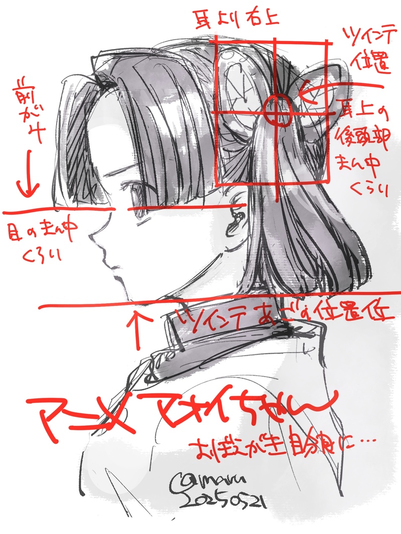 へ〜って今更あらためて見てみただけ… キャラビジュアルって原作とアニメと違うし一期と二期とだけでも変わったりするから何とも言えないけど、結構手癖で毎回適当に描いてるけどこれくらいがベースかなっていう。ツインテの位置はアイドルとか見てもリアルにここの位置が良さげ。前髪長くしがちだけど原作はもっと短い時あるね。ツインテの長さも顎位かなあ。多分今まで描いてきたの全部違いそう。アニメ後頭部もっとデカいし…