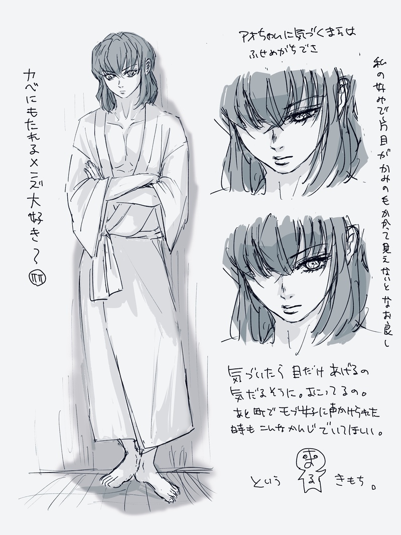 まだ初夜の引きずって勝手に… 壁に寄りかかってるのすごい好きなんだよね。肩を壁に寄りかかっててもいい。なんも興味ありませんみたいな顔してアオイちゃん待ってるシーンとか現パロでも原作軸でもあるやん?大体こう焦れてるっていうか他の男に嫉妬してて内心余裕ない感じでちょっと怒り気味に目線あげるのーーすきーー(鬼滅のtube見ながら描いた。地上波初放送ー!煉獄さーん!そして遊郭編ドキドキやばい