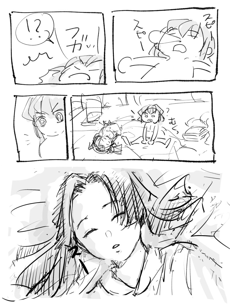 これもまえーーーにお題で描いた遊び疲れて一緒に寝ちゃう2人?のその後みたいなの。ツイに載せてたけど消してたやつ。こっそりキスするのいいよね。そのシーンこそ見たいんだけど。またいつか描けるかな。毎日暑すぎて何するのもだるだるでやる気にならんよね…夏は暑くてだるいし冬は寒くて動きたくないし春と秋はいい季節だからそれはそれで何もしたくないんだよ!