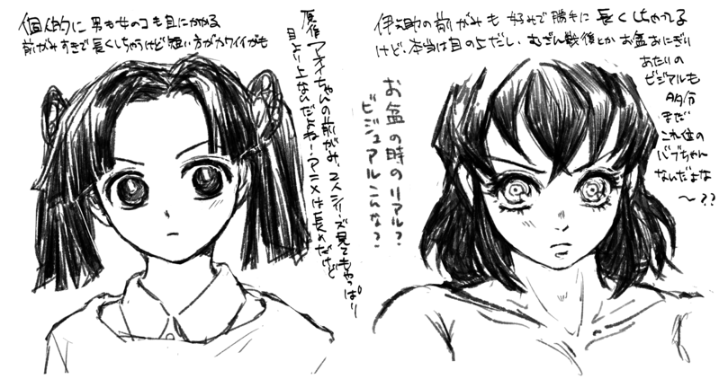 前髪、短いんだよね原作は!っていう話。アニメアオちゃんはちょい長め。ただイケメンと美女の目にかかる前髪は正義を心に生きてきたから勝手に長くしちゃうんだけど、短いアオちゃん可愛いな?って今更思い。伊之助は短い方が断然幼くなる。バブがリアルなんだな…でもきっと17歳に差し掛かる辺りで色々目覚めるんだな(アオちゃんに)