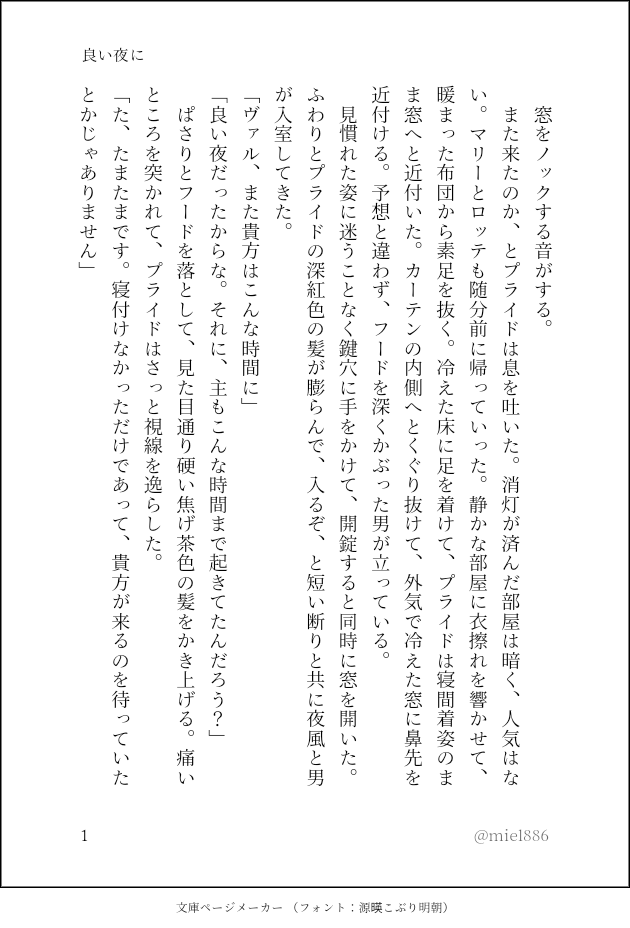 miel886☆quiet followDONEヴァルプラ原作世界観、深夜の逢瀬 ##ヴァルプラ show all(+6 images) Tap to full screen (size:630x928).Repost is prohibited Let's send reactions! freqpopularsnackothersPayment processing Replies from the creator Follow creator you care about!☆quiet follow miel886DONEセドティア素直になる呪いの話 2584 miel886DONEカラプラカラムの過去と兄に関して、僅かにねつ造が入ります。苦手な方はご注意ください。 8 miel886MAIKINGヴァルプラ続きも書くかも 341 miel886DONEヴァルプラ現パロ、付き合ってる二人のデート 9 miel886DONEアサプラ原作世界観、もしもの話 9 miel886DONEヴァルプラ原作世界観、深夜の逢瀬 7