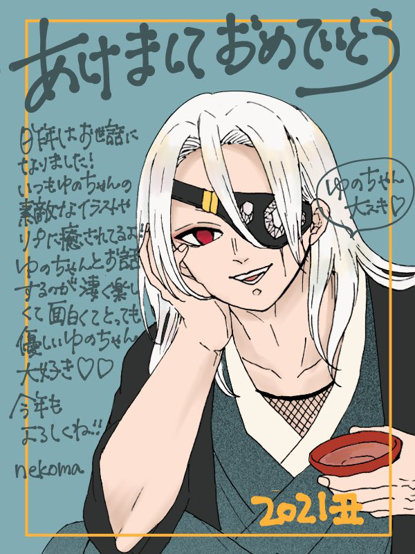 ねこちゃんからお年賀イラスト🥺🥺💕💕私がモジモジしてたら交換したいって言ってくれたの😌💕💕でね、クオリティがね、いつもの高クオリティじゃん🤣🤣ちょっとちょっと😭‼️‼️わたしが渡したやつwwwwスマン🙏ってなったのに喜んでくれて優しすぎる😭🧡宇髄さんめっちゃイケメンだし色味オシャレ♡