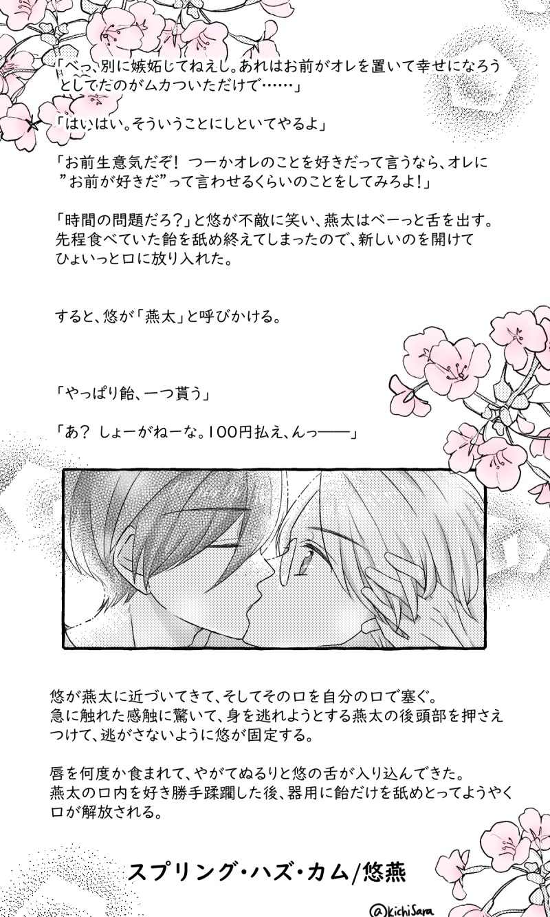 きゅうり職人☆quiet followDONE前に呟いた妄言を抜粋して挿絵っぽいのをつけてみた(この妄言、実はわりと気に入ってる)https://t.co/I1YBV4PmW1?amp=1やっぱり推しのキッスを描くと元気になるね/// Tap to full screen (size:1200x2000).Repost is prohibited きゅうり職人MOURNING供養③【没漫画③】いやまさか3本になるとか予想外だよ……大したもの描いてないのにな……まあもはや誰も見てないだろうしいいか(笑)今年ものんびりきままに描くぞ~! 11 きゅうり職人MOURNING供養②【没漫画②】 5 きゅうり職人MOURNING新年早々没絵供養①(まさかの収まりきらなかった)今よりも大分絵が下手なのとかなり中途半端でsorry 16 きゅうり職人MOURNING秋に恋 きゅうり職人Reuse Halloween二択に見せかけた一択所詮この世は弱肉強食。強ければ(性的に)食い、弱ければ(性的に)食われるのだ――🐰「みゅっ~!(こいつどーにかして!!!)」😽「パクっといくぞー💖」 きゅうり職人DONE燕太のことをかわいいと思ってキッスしちゃう悠ちゃんマセガキかわいいね!ここ保育園のお砂場で誰かに見られるかもしれないんだぞ?止められなかったのかい?そっかぁ…「世界でただ一人への止められない気持ち」の現れだもんな…///悠燕は運命じゃないけど先トエは運命だからね…幸せになれよ…というか「I'll give you all my love」ってやばいな…【俺(オレ)の愛を全部あげる】って(文字数 recommended works 砂先荏DOODLE姉が居なくなった日 すいそうDOODLE落書き腐向けっぽいのちょっとあります最後単行本未収録分本誌ネタバレ注意 9 ataunkDONEしのぶさん#鬼滅の刃#胡蝶しのぶ ベツィREHABILI すいそうCAN’T MAKEなんかちがう shu-na**DONE「私はちゃんと笑えていただろうか」 翠茄(suica)PROGRESS試行錯誤の様子を笑ってほしい。ぎゆしのだよ。 R21REHABILIまたまた鬼滅、お題は「チョコと推しキャラ」でしたバレンタインデーにこっそりチョコを渡しご満悦なしのぶさんですちなみにこの日義勇さんは折角のバレンタインデーなのに鮭大根の店に入り、しのぶさんはとてもご立腹でした しばねこDONEしのぶさんおめでとうございます🦋出遅れのためしおり風に…