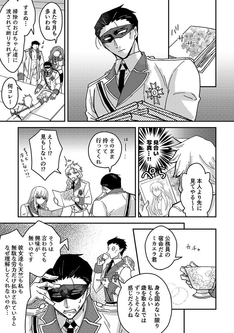 そこまで考えてミカエラはじろり、と目の前で自身の下僕に押さえつけられた女の部屋の中を見渡す。極めて平均的な1kのマンションの一室はこれまた平均的な20後半の女性の部屋といった物で、異様なのは外に繋がる扉についた無数の南京錠とベニヤ板で打ち付けられた窓くらいだろう。ミカエラが立つリビングの扉からまっすぐ前に置かれたベッドの上、呑気に座った件の男は鎖で繋がれた片手をあげ、よう、とこれまた呑気に笑っている。あまりの態度にこめかみがぴくり、と疼いたが、足元の女が押さえつけられた口でうーうーとやかましく呻くのがそれ以上に不快で、その羽虫の羽音を止めるべく下僕に命令を下すと、締め上げていた腕をさらに締め上げる。短い悲鳴の後に荒い呼吸を繰り返すだけとなった哀れな女に、少しだけ溜飲が下がるのを感じた。