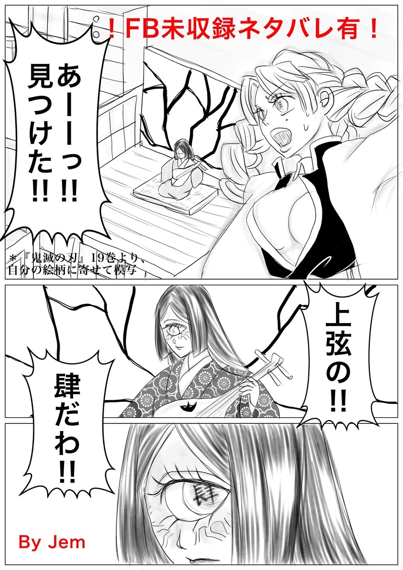 アニメ鳴👁️ちゃんも有能そうでいい感じでしたね。以前描いた鳴👁️戦パロも出しちゃいます。鳴👁️ちゃん、上弦である以上◯ればできる子のはずなんです!◯らなかったのは、もう🐍🍡仲間としか思えません!さらに②ではあの方も⁉️