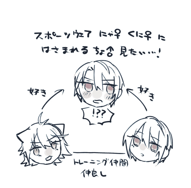 スポーツウェアにゃん♀&くに♀に挟まれるちょぎ♂見たい!ならくがき(煩悩)