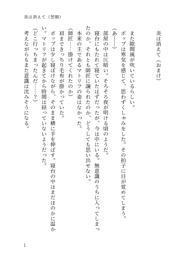 【説明】マトポプ、メドローア修行期間中。ポイピク投稿の「炎は消えて」の次の日の朝のお話です。