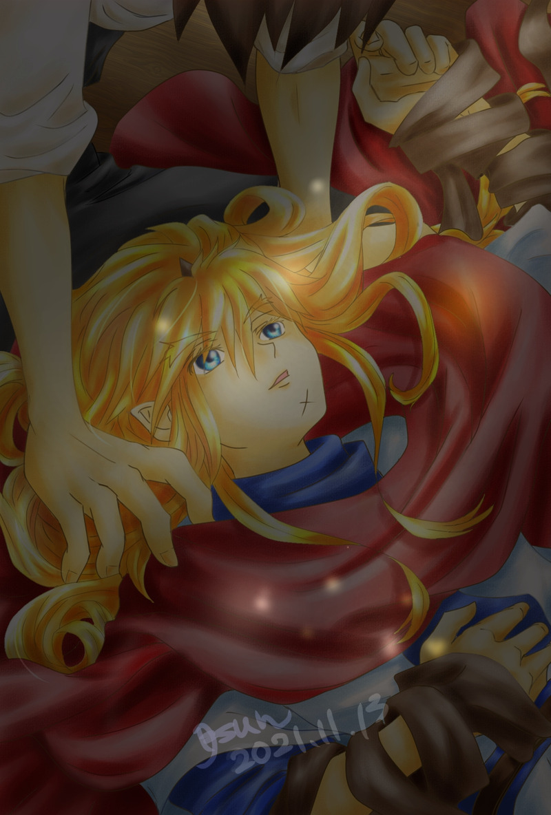 髪 レイヤー(加算発光)、レイヤー(焼き込みカラー)水彩色鉛筆