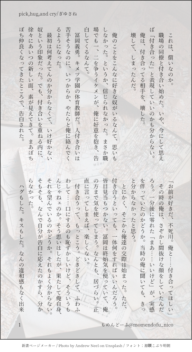 もめんどーふ☆quiet followDONEキメ学ぎゆさねいっこ前の話のさねサイド #ぎゆさね teethingRing show all(+13 images) Tap to full screen (size:618x1132).Repost is prohibited Let's send reactions! freqpopularsnackothersPayment processing Replies from the creator Follow creator you care about!☆quiet follow もめんどーふDONEぎゆさね版ドロライ「焼き鳥、しっぽり」DDぎゆさね2人きりで2次会する2人の話 4 もめんどーふDONE余生ぎゆさね心願成就を果たしたぎゆの話 5 もめんどーふDONE現役ぎゆさねワンライ「狩人、狼」の幕間ぎゆが気を失ってる間の話※少しですが流血描写があります。苦手な方はご注意ください 4 もめんどーふDONEぎゆさね版ドロライ「狩人、狼」現役ぎゆさねさねの救助に向かうぎゆさんの話※ご都合血鬼術が出てきます、苦手な方はご注意ください 5 もめんどーふDONEフロセキュぎゆさねぎゆさね版ドロライ「雷雨、傘」と、その続きのさらに続きの話※注意※下記の要素を含みます、苦手な方はご注意下さい・さねが体を売ってお金を稼いでいます・台詞だけですが、モブと絡んでいる描写があります 13 もめんどーふDONEフロセキュぎゆさねぎゆさね版ドロライ「雷雨、傘」と、その続きを纏めたものです※注意※下記の要素を含みます、苦手な方はご注意下さい・さねが体を売ってお金を稼いでいます・台詞だけですが、モブと絡んでいる描写があります・書いている本人はハッピーエンドのつもりですが、人によってはそう思わないかもしれません 13 related works きゃれみMENU新刊サンプルr-18部分です18歳以上ですか?(yes/no) 4 Kasumi KiriuDOODLE【ぎゆさね】※18歳(高卒)未満閲覧禁止遅くなりましたが💦💦ホワイトデーポストで頂いた素敵なお返しをお題にして描きました😊ありがとうございました❣フロセキュぎゆさね🌊🍃勤務中に制服を着たままいたす2人。シチュなど苦手な方はスルーをお願いします🙇しっかりinしてます🍌背後注意⚠ Kasumi KiriuDONE【ぎゆさね】2022ハロパロネタです🔞してやったりな北風🍃ちゃんがまんまとぎゆカサコに返り討ちにあうお話。全4P。後半🍌出ますので18歳未満閲覧禁止です× 4 koketamaDOODLEねこちゃん🐈⬛ Kasumi KiriuDONE【ぎゆさね】🔞18歳未満閲覧禁止原画展グッズののトミセンジャージが上下セットではなく上しかなかった事に端を発したネタです。勝手にセンシティブジャージと銘打っております。もろに出てますので18歳未満は閲覧禁止です× 3 Kasumi KiriuDONE【ぎゆさね】6月9日69の日ということで🍌描きたいとこだけ1ページ漫画です18歳未満閲覧禁止🈲 koketamaDOODLEねこちゃん🐱 i7_osk5DOODLEぎゆさねせっすす表情の練習 ymnkTRAINING練習ー recommended works Kazu*🍃MOURNINGHALLOWEEN🎃👻終わってしまった間に合わなかった落書き🖋️を供養する…ぎゆ帰宅待ちのさね💙💚さね可愛く描けたんだけどな☺ もめんどーふREHABILI前に書いたやつから何となく続いてるDKぎゆさねやまもおちもいみもないとにかく書いて書いて、リハビリじゃーいφ(・ω・`) 6 あぐりOVER 2M USERS!ぎゆさね。なんかものすごく疲れてた日に、帰りの電車で書きました。疲れてたんです。 もめんどーふDONEワンライ「うなじ、おでこ」DDぎゆさねなんでもいいから書けと、気にせず書けと書いたもの原稿って響きに憧れる短編野郎コンプレックスの塊ですね 4 もめんどーふDONE胸につかえた何かを吐き出したくてかいたものキメ学ぎゆさね結婚式(オンリー)まで数日のお話 4 もめんどーふDONEぼちライ21「この瞬間に閉じ込められていたい、2人きりのホーム」DKぎゆさねぎゆの進学前、高校生活最後の時間を過ごす話とある曲をイメージして書いてますパスはさね誕1h迸る熱いパトスで書いたのべつまくなしすいこうはあとまわし 5 もめんどーふDONEワンライ「映画、主役」現パロぎゆさね❤️シーンに抵抗感を覚えるぎゆの話・俳優パロ・お互いベタ惚れ・🧸は某ほわいとでーのもの1日遅刻したしだらだらし過ぎて1日かかった(ワン(デイ)ライ)楽しかったです 4 じょでぃPAST短編まとめ過去絵リメイク 15 モまくまくDOODLE⚠️チャプター4注意ですごめんなさい😭推し絵師様のせいで嫌われるタイプの夢絵が好きなんですよ…