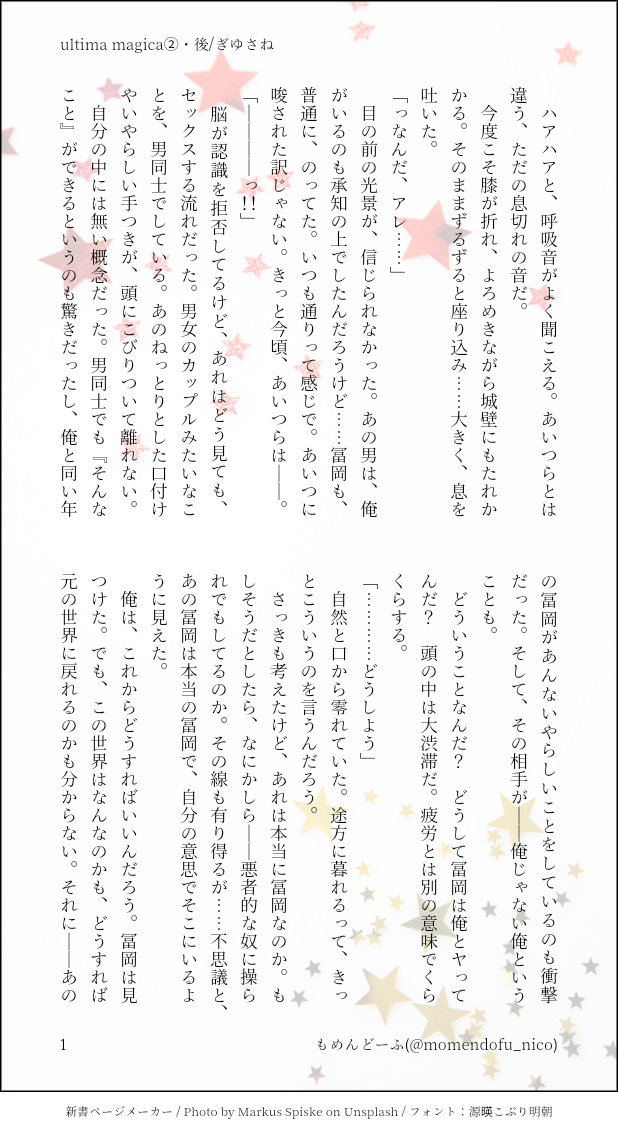 もめんどーふ☆quiet followDONEDKぎゆさねトンデモファンタジー話②後編 #ぎゆさね teethingRing show all(+3 images) Tap to full screen (size:618x1132).Repost is prohibited Let's send reactions! freqpopularsnackothersPayment processing Replies from the creator Follow creator you care about!☆quiet follow もめんどーふDONEぎゆさね版ドロライ「焼き鳥、しっぽり」DDぎゆさね2人きりで2次会する2人の話 4 もめんどーふDONE余生ぎゆさね心願成就を果たしたぎゆの話 5 もめんどーふDONE現役ぎゆさねワンライ「狩人、狼」の幕間ぎゆが気を失ってる間の話※少しですが流血描写があります。苦手な方はご注意ください 4 もめんどーふDONEぎゆさね版ドロライ「狩人、狼」現役ぎゆさねさねの救助に向かうぎゆさんの話※ご都合血鬼術が出てきます、苦手な方はご注意ください 5 もめんどーふDONEフロセキュぎゆさねぎゆさね版ドロライ「雷雨、傘」と、その続きのさらに続きの話※注意※下記の要素を含みます、苦手な方はご注意下さい・さねが体を売ってお金を稼いでいます・台詞だけですが、モブと絡んでいる描写があります 13 もめんどーふDONEフロセキュぎゆさねぎゆさね版ドロライ「雷雨、傘」と、その続きを纏めたものです※注意※下記の要素を含みます、苦手な方はご注意下さい・さねが体を売ってお金を稼いでいます・台詞だけですが、モブと絡んでいる描写があります・書いている本人はハッピーエンドのつもりですが、人によってはそう思わないかもしれません 13 related works Kasumi KiriuDOODLE【ぎゆさね】※18歳(高卒)未満閲覧禁止遅くなりましたが💦💦ホワイトデーポストで頂いた素敵なお返しをお題にして描きました😊ありがとうございました❣フロセキュぎゆさね🌊🍃勤務中に制服を着たままいたす2人。シチュなど苦手な方はスルーをお願いします🙇しっかりinしてます🍌背後注意⚠ Kasumi KiriuDONE【ぎゆさね】6月9日69の日ということで🍌描きたいとこだけ1ページ漫画です18歳未満閲覧禁止🈲 ymnkTRAINING練習ー koketamaDOODLEねこちゃん🐱 きゃれみMENU新刊サンプルr-18部分です18歳以上ですか?(yes/no) 4 Kasumi KiriuDONE【ぎゆさね】🔞18歳未満閲覧禁止原画展グッズののトミセンジャージが上下セットではなく上しかなかった事に端を発したネタです。勝手にセンシティブジャージと銘打っております。もろに出てますので18歳未満は閲覧禁止です× 3 Kasumi KiriuDONE【ぎゆさね】2022ハロパロネタです🔞してやったりな北風🍃ちゃんがまんまとぎゆカサコに返り討ちにあうお話。全4P。後半🍌出ますので18歳未満閲覧禁止です× 4 i7_osk5DOODLEぎゆさねせっすす表情の練習 koketamaDOODLEねこちゃん🐈⬛ recommended works Kazu*🍃TRAINING目配せ柱たち♡お互いに顔が好きなん…💙💚 2 もめんどーふDONEこちらでも投下シリーズぎゆさねワンライのやつです奇をてらおうとして、お題に沿えてない気もしますが、書いてて楽しかったからヨシ! 5 あぐりDONE20210227ぎゆさねワンドロ「ベランダ」お借りしました。遊廓ネタです。 5 ramozzgisaDONEいつかのワンドロ【雨音】 5 もめんどーふDONEオールバックぎゆが描きたかっただけの話漫画…絵…難しい多分もっと早くできる手段があるんだろうな(´・ω・`)精進します 4 もめんどーふDONEぼちぼちかいてたやつ原作軸、柱ぎゆと隊士さねさねの回想的なお話ですよろしければ、どうぞ 9 Kazu*🍃DONE結婚💒初夜ぎゆさね…いつものぎゆのガツガツ感じゃなく…優しく愛でられ蕩ける愛されスローセッで長くいちゃラブしてるかなと妄想するのです…💓 omamepakuDONEキメ学ぎゆさね息をするように同棲中フォロワーさんに許可を頂いて、上の句に続く下の句を書きました!!無駄に長くなったのは、網タイツの描写に力を注いだからです!!(ドヤ顔)⚠️最後のページに参考資料写真(アダルトグッズ)あります⚠️うさ耳うさしっぽ、網タイツとブラ&ランジェリーを身につける実弥がいます⚠️ふたりとも酔ってるので、少々アホっぽい感じでイチャイチャしてます 11 もめんどーふDONEぼちライ31「百年の恋、永遠の切なさ」DKぎゆさね前世を覚えてるさねと覚えてないぎゆさんの約束の話ぼちライ30の話をイメージしてますが、単品でもいける(はず)よろしければ、読んでもらえたら嬉しいです1.75hそれでもワンライと言い張る 6