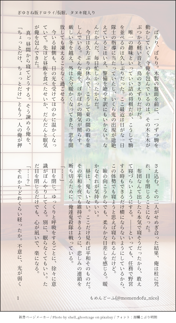 もめんどーふ☆quiet followDONEぎゆさね版ドロライ「仮眠、タヌキ寝入り」現役ぎゆさね夢?をみるぎゆの話 #ぎゆさね teethingRing #ぎゆさね版ドロライ giyusaneVersionOfDolorai show all(+3 images) Tap to full screen (size:618x1132).Repost is prohibited Let's send reactions! freqpopularsnackothersPayment processing Replies from the creator Follow creator you care about!☆quiet follow もめんどーふDONEキメ学ぎゆさねさねがとろけてるだけの話のっけから致してるので、18歳未満の方は閲覧をご遠慮ください 5 もめんどーふDONEぎゆさね版ドロライ「焼き鳥、しっぽり」DDぎゆさね2人きりで2次会する2人の話 4 もめんどーふDONE余生ぎゆさね心願成就を果たしたぎゆの話 5 もめんどーふDONE現役ぎゆさねワンライ「狩人、狼」の幕間ぎゆが気を失ってる間の話※少しですが流血描写があります。苦手な方はご注意ください 4 もめんどーふDONEぎゆさね版ドロライ「狩人、狼」現役ぎゆさねさねの救助に向かうぎゆさんの話※ご都合血鬼術が出てきます、苦手な方はご注意ください 5 もめんどーふDONEフロセキュぎゆさねぎゆさね版ドロライ「雷雨、傘」と、その続きのさらに続きの話※注意※下記の要素を含みます、苦手な方はご注意下さい・さねが体を売ってお金を稼いでいます・台詞だけですが、モブと絡んでいる描写があります 13 related works もめんどーふREHABILIぎゆさね版ドロライ「うっかり、らしくない」キメ学ぎゆさねらしくない自分に戸惑うさねの話 4 もめんどーふDONEぎゆさね版ドロライ「狩人、狼」現役ぎゆさねさねの救助に向かうぎゆさんの話※ご都合血鬼術が出てきます、苦手な方はご注意ください 5 つきこDONE #ぎゆさね版ドロライぎゆさね版ドロライ、お題「大寒」をお借りしました。現役軸。※注意※体の関係はありますが、まだひりひりしているぎゆさねです。苦手な方はお控えください。 4 またたびDONE #ぎゆさね版ドロライお題:いつもの場所読む人を選ぶSS書きました。初っ端から地雷注意⚠️ワンクッション置くので注意書きをご確認ください。余生軸、できてはいないぎゆさね。全6P・ぎゆとモブ女の間に子がいます・ぎゆがまあまあダメ男・ぬるいですが🔞・後味もすっきりはしない・ビジュアルは例のガールズフェスぎゆさねです。 6 もめんどーふDONEぎゆさね版ドロライ「表面、溢れる」フロセキュぎゆさね違和感の正体に気づくさねの話※うっすらですが、他の男とさねが絡んでる描写があります。苦手な方はご注意ください 4 もめんどーふDONEぎゆさね版ドロライ「サングラス、海」キメ学ぎゆさねドライブデートする2人の話 4 もめんどーふDONEぎゆさね版ドロライ「記念、ずっと」余生ぎゆさね木を植える2人のはなし 3 もめんどーふDONEぎゆさね版ドロライ「会いたい、おもい」DDぎゆさね色々気にして尻込みしちゃうぎゆの話 4 つきこDONE #ぎゆさね版ドロライぎゆさね版ドロライ、お題「噂」をお借りしました。現パロDK(男子校)ぎゆさね、男性関係でいろいろ穏やかならぬ噂のあるさねみと同じクラスになったぎゆのお話です。※注意※さねみがモブキャラと関係があることを感じさせる描写があります。苦手な方はお控えください。直接的な描写はまったくありませんが、内容的に念のためR18にしております。 7