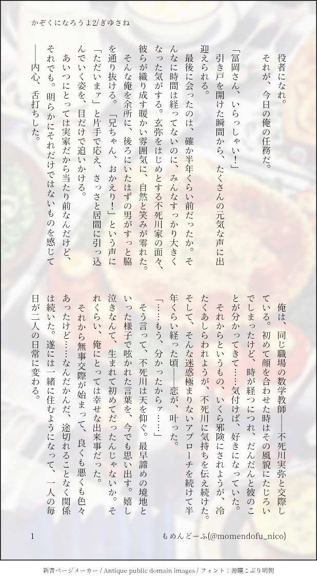 もめんどーふ☆quiet followDONEキメ学ぎゆさね不死川家の鍋パにお邪魔するぎゆの話だいぶ前にアップした「かぞくになろうよ」の1年後くらいの話です2人が不穏ですが、ハピエンです #ぎゆさね teethingRing show all(+12 images) Tap to full screen (size:618x1132).Repost is prohibited Let's send reactions! freqpopularsnackothersPayment processing Replies from the creator Follow creator you care about!☆quiet follow もめんどーふDONEキメ学ぎゆさね不死川家の鍋パにお邪魔するぎゆの話だいぶ前にアップした「かぞくになろうよ」の1年後くらいの話です2人が不穏ですが、ハピエンです 13 もめんどーふDONEぎゆさね版ドロライ「仲良し、仲裁」キメ学ぎゆさね付き合いたてで慣れないさねの話 5 もめんどーふDONEぎゆさね版ドロライ「舞台、芝居」余生ぎゆさね2人で舞台を観に行く話 4 もめんどーふREHABILIDDぎゆさねよく分からないまま始まった2人が、徐々に答えに辿り着く話※1行だけですが、さねがぎゆ以外とキスしている描写があります。苦手な方はご注意ください 12 もめんどーふDONEキメ学ぎゆさねさねがとろけてるだけの話のっけから致してるので、18歳未満の方は閲覧をご遠慮ください 5 もめんどーふDONEぎゆさね版ドロライ「焼き鳥、しっぽり」DDぎゆさね2人きりで2次会する2人の話 4 related works ymnkTRAINING練習ー Kasumi KiriuDONE【ぎゆさね】6月9日69の日ということで🍌描きたいとこだけ1ページ漫画です18歳未満閲覧禁止🈲 koketamaDOODLEねこちゃん🐱 koketamaDOODLEねこちゃん🐈⬛ もめんどーふDONEぎゆさね版ドロライ「団扇、風鈴」現役軸ぎゆさね手合わせ中に倒れちゃったさねの話1.0h 5 きゃれみMENU新刊サンプルr-18部分です18歳以上ですか?(yes/no) 4 i7_osk5DOODLEぎゆさねせっすす表情の練習 Kasumi KiriuDOODLE【ぎゆさね】※18歳(高卒)未満閲覧禁止遅くなりましたが💦💦ホワイトデーポストで頂いた素敵なお返しをお題にして描きました😊ありがとうございました❣フロセキュぎゆさね🌊🍃勤務中に制服を着たままいたす2人。シチュなど苦手な方はスルーをお願いします🙇しっかりinしてます🍌背後注意⚠ Kasumi KiriuDONE【ぎゆさね】🔞18歳未満閲覧禁止原画展グッズののトミセンジャージが上下セットではなく上しかなかった事に端を発したネタです。勝手にセンシティブジャージと銘打っております。もろに出てますので18歳未満は閲覧禁止です× 3 recommended works ymnkTRAINING練習ー もめんどーふDONEワンライ「贈り物、誕生日(実弥)」DKぎゆさね修学旅行の話以前投下したツイートをアレンジしたもの 4 もめんどーふDONEひっそり続く結婚式シリーズ結婚前夜に各々の友人と語り合う話さねは出てこないけど、ぎゆさねです 3 もめんどーふDONEワンライ「着替え、隙間」キメ学ぎゆさね時間オーバーしたし、ちょっと悔しい感じまあ書けたからよしとする 5 kiyo_techi2DOODLEHoneys & bunny …c⌒っ.ω.)っ もめんどーふINFO10/16 凪いでゆれる風車3 新刊サンプルです吸血鬼の居候A5/68P/600円/R18死にかけの吸血鬼・義勇が、実弥に拾われ居候する話通販: https://ec.toranoana.jp/joshi_r/ec/item/040031018663/ 17703 Kazu*🍃DONEweb🍃刀嵐4【楔-くさび-】web🍃刀嵐3【棘-おどろ-】🔞は↓コチラ↓https://profcard.info/u/C1SdmMdVAfYCSjF1BS9faRcNz8w2 25 もめんどーふDONEキメ学ぎゆさねただいちゃいちゃしてるだけの話ぎゆさんの台詞を極力排除した結果 4 ywanyanDOODLE樱桃品尝时间⚠️:69 下品 ooc 2