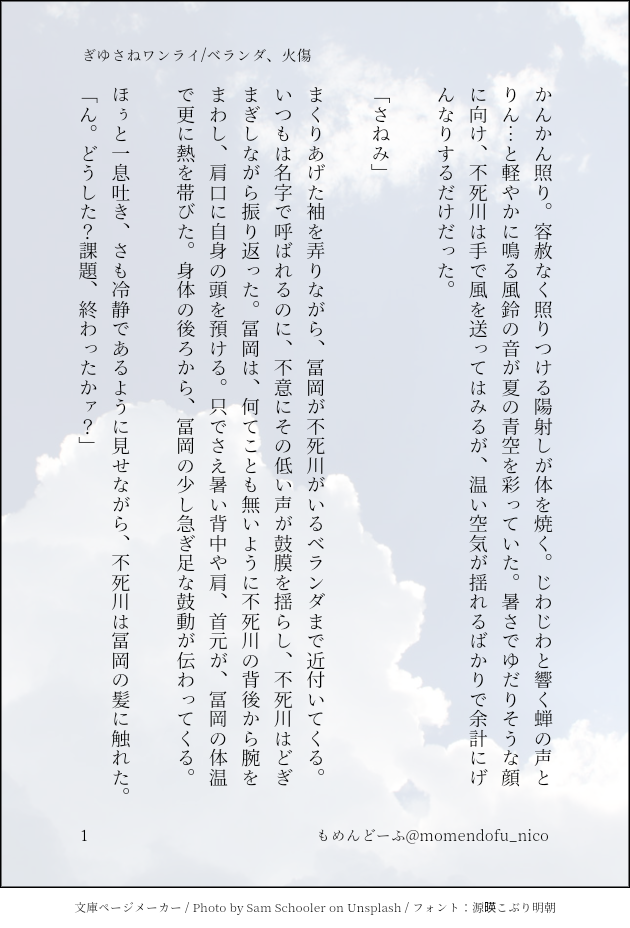 もめんどーふ☆quiet followDONEいつものようにワンドロワンライ今回は内容よりも仕込みをメインにやりました誰も気付かなくてもいい、自分がそうしたかっただけえるしっているか #ぎゆさね teethingRing show all(+2 images) Tap to full screen (size:630x928).Repost is prohibited Let's send reactions! freqpopularsnackothersPayment processing Replies from the creator Follow creator you care about!☆quiet follow もめんどーふDONEぎゆさね版ドロライ「焼き鳥、しっぽり」DDぎゆさね2人きりで2次会する2人の話 4 もめんどーふDONE余生ぎゆさね心願成就を果たしたぎゆの話 5 もめんどーふDONE現役ぎゆさねワンライ「狩人、狼」の幕間ぎゆが気を失ってる間の話※少しですが流血描写があります。苦手な方はご注意ください 4 もめんどーふDONEぎゆさね版ドロライ「狩人、狼」現役ぎゆさねさねの救助に向かうぎゆさんの話※ご都合血鬼術が出てきます、苦手な方はご注意ください 5 もめんどーふDONEフロセキュぎゆさねぎゆさね版ドロライ「雷雨、傘」と、その続きのさらに続きの話※注意※下記の要素を含みます、苦手な方はご注意下さい・さねが体を売ってお金を稼いでいます・台詞だけですが、モブと絡んでいる描写があります 13 もめんどーふDONEフロセキュぎゆさねぎゆさね版ドロライ「雷雨、傘」と、その続きを纏めたものです※注意※下記の要素を含みます、苦手な方はご注意下さい・さねが体を売ってお金を稼いでいます・台詞だけですが、モブと絡んでいる描写があります・書いている本人はハッピーエンドのつもりですが、人によってはそう思わないかもしれません 13 related works ymnkTRAINING練習ー Kasumi KiriuDONE【ぎゆさね】6月9日69の日ということで🍌描きたいとこだけ1ページ漫画です18歳未満閲覧禁止🈲 Kasumi KiriuDOODLE【ぎゆさね】※18歳(高卒)未満閲覧禁止遅くなりましたが💦💦ホワイトデーポストで頂いた素敵なお返しをお題にして描きました😊ありがとうございました❣フロセキュぎゆさね🌊🍃勤務中に制服を着たままいたす2人。シチュなど苦手な方はスルーをお願いします🙇しっかりinしてます🍌背後注意⚠ koketamaDOODLEねこちゃん🐱 Kasumi KiriuDONE【ぎゆさね】🔞18歳未満閲覧禁止原画展グッズののトミセンジャージが上下セットではなく上しかなかった事に端を発したネタです。勝手にセンシティブジャージと銘打っております。もろに出てますので18歳未満は閲覧禁止です× 3 Kasumi KiriuDONE【ぎゆさね】2022ハロパロネタです🔞してやったりな北風🍃ちゃんがまんまとぎゆカサコに返り討ちにあうお話。全4P。後半🍌出ますので18歳未満閲覧禁止です× 4 きゃれみMENU新刊サンプルr-18部分です18歳以上ですか?(yes/no) 4 i7_osk5DOODLEぎゆさねせっすす表情の練習 koketamaDOODLEねこちゃん🐈⬛ recommended works シイナPROGRESS5億年ぶりにレン様描いた Kazu*🍃DONEシャーペン落書き🖋️してそのまま放置してたやつ…赤ブー支援に描けて良かったな❤️ 2 Kazu*🍃TRAINING目配せ柱たち♡お互いに顔が好きなん…💙💚 2 Kazu*🍃DOODLE余生のぎゆさね21歳なのに…鬼殺の頃の彼らって大人っぽぃぎゆの短髪も好き♡さねがととのえてるの悶える仄かに寄り添って歩く姿好きだな… 2 もめんどーふDONEワンライ:賭け、自信DKぎゆさね、のつもりですが、そんなに年齢関係ない思い付いた勢いのままにかいたので、なんだかポエミイだしソードマスターヤマト的な感じ_(:3」∠)_書くことに意義がある、賑やかしになればいい、って気持ちで書ききりました(^_^;) 5 しかはねDONEワンライお題「爪」仲良くお付き合いしてる体育教師×数学教師です。モブ男子生徒たちがニギヤカです。爪が剥がれたりしてます。大人げないセンセーになってしまう。(20210703) 11 もめんどーふTRAININGなんてことねえログトレスやらなぎおかさんやらごった煮 11 mochixmugiDONEさねのお誕生日を頑張って祝うぎゆの両片想いDKぎゆさねです!おばみつ要素、善良なモブ女子出てきます。さねお誕生日おめでとう🥳✨ 11 もめんどーふDONEワンライ「誕生日、バレンタイン」DKぎゆさね頑張ってチョコを渡すよくある話1.0h去年と同じような話になってしまった…orz 5