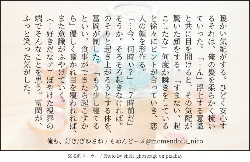 もめんどーふ☆quiet followDONE小噺集軸は色々ごった煮です #ぎゆさね teethingRing show all(+4 images) Tap to full screen (size:910x590).Repost is prohibited Let's send reactions! freqpopularsnackothersPayment processing Replies from the creator Follow creator you care about!☆quiet follow もめんどーふDONEぎゆさね版ドロライ「焼き鳥、しっぽり」DDぎゆさね2人きりで2次会する2人の話 4 もめんどーふDONE余生ぎゆさね心願成就を果たしたぎゆの話 5 もめんどーふDONE現役ぎゆさねワンライ「狩人、狼」の幕間ぎゆが気を失ってる間の話※少しですが流血描写があります。苦手な方はご注意ください 4 もめんどーふDONEぎゆさね版ドロライ「狩人、狼」現役ぎゆさねさねの救助に向かうぎゆさんの話※ご都合血鬼術が出てきます、苦手な方はご注意ください 5 もめんどーふDONEフロセキュぎゆさねぎゆさね版ドロライ「雷雨、傘」と、その続きのさらに続きの話※注意※下記の要素を含みます、苦手な方はご注意下さい・さねが体を売ってお金を稼いでいます・台詞だけですが、モブと絡んでいる描写があります 13 もめんどーふDONEフロセキュぎゆさねぎゆさね版ドロライ「雷雨、傘」と、その続きを纏めたものです※注意※下記の要素を含みます、苦手な方はご注意下さい・さねが体を売ってお金を稼いでいます・台詞だけですが、モブと絡んでいる描写があります・書いている本人はハッピーエンドのつもりですが、人によってはそう思わないかもしれません 13 related works ymnkTRAINING練習ー Kasumi KiriuDONE【ぎゆさね】6月9日69の日ということで🍌描きたいとこだけ1ページ漫画です18歳未満閲覧禁止🈲 Kasumi KiriuDOODLE【ぎゆさね】※18歳(高卒)未満閲覧禁止遅くなりましたが💦💦ホワイトデーポストで頂いた素敵なお返しをお題にして描きました😊ありがとうございました❣フロセキュぎゆさね🌊🍃勤務中に制服を着たままいたす2人。シチュなど苦手な方はスルーをお願いします🙇しっかりinしてます🍌背後注意⚠ きゃれみMENU新刊サンプルr-18部分です18歳以上ですか?(yes/no) 4 Kasumi KiriuDONE【ぎゆさね】🔞18歳未満閲覧禁止原画展グッズののトミセンジャージが上下セットではなく上しかなかった事に端を発したネタです。勝手にセンシティブジャージと銘打っております。もろに出てますので18歳未満は閲覧禁止です× 3 Kasumi KiriuDONE【ぎゆさね】2022ハロパロネタです🔞してやったりな北風🍃ちゃんがまんまとぎゆカサコに返り討ちにあうお話。全4P。後半🍌出ますので18歳未満閲覧禁止です× 4 i7_osk5DOODLEぎゆさねせっすす表情の練習 koketamaDOODLEねこちゃん🐱 koketamaDOODLEねこちゃん🐈⬛ recommended works あぐりDONE20210227ぎゆさねワンドロ「ベランダ」お借りしました。遊廓ネタです。 5 もめんどーふDONEワンライ「寝顔、目覚め」DKぎゆさねありきたりだなぁ凹んでる時にかくと、ほんと辛くなる 6 mi_sora280DONE蝉のオノマトペをぎゆさねで描いてみました。今回は効果音とサネチの足芸に気を配りました。直接的には描いてないけどR18です。 もめんどーふDONEぼちライ27「飲みかけの珈琲、過ちのキス、染み入る想い」フロセキュぎゆさね好奇心だった筈なのに…というよくある話1.5h展開が新幹線…もっとじっくりこねくり回したかった 5 もめんどーふDONEぼちライ41「真っ白なシーツ、(いっそ孕めばいいのに)、恋人と友人の垣根」フロセキュぎゆさね本気になったけどどうにもならないさねの話直接的ではないですが、少しいかがわしいことを匂わせてます1.0hおまえほんとそれ好きな、っていわれそう仰る通りです 4 めめ汰DONE赤iブーiさんの👰🏻♀️フiェスにて推しカプちゃんが3組も選ばれたので支援!余生は喧嘩しつつも仲良く過ごしてくれることを願うばかり 2 もめんどーふDONEフロセキュぎゆさね体を売ってるさねと、買ってるぎゆの話④あともう少しだけ続くんじゃ 10 もめんどーふDONEDKぎゆさねぐっだぐだな恋のはなしハピエンですが、さねが別の人を好きだったり、ぎゆに彼女ができたりする場面があります苦手な方はご注意ください 16889 もめんどーふDONEぎゆさね版ドロライ「土用、すりすり」余生ぎゆさねとある土用の日の話 4