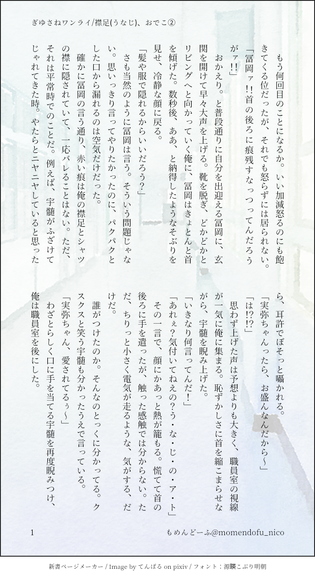 もめんどーふ☆quiet followDONEワンライ「うなじ、おでこ」その②キメ学ぎゆさね推敲もなにもあったもんじゃないけど、気にしてたらなにも書けない何か、なんでもいいから書きたかった #ぎゆさね teethingRing show all(+4 images) Tap to full screen (size:618x1132).Repost is prohibited Let's send reactions! freqpopularsnackothersPayment processing Replies from the creator Follow creator you care about!☆quiet follow もめんどーふDONEぎゆさね版ドロライ「焼き鳥、しっぽり」DDぎゆさね2人きりで2次会する2人の話 4 もめんどーふDONE余生ぎゆさね心願成就を果たしたぎゆの話 5 もめんどーふDONE現役ぎゆさねワンライ「狩人、狼」の幕間ぎゆが気を失ってる間の話※少しですが流血描写があります。苦手な方はご注意ください 4 もめんどーふDONEぎゆさね版ドロライ「狩人、狼」現役ぎゆさねさねの救助に向かうぎゆさんの話※ご都合血鬼術が出てきます、苦手な方はご注意ください 5 もめんどーふDONEフロセキュぎゆさねぎゆさね版ドロライ「雷雨、傘」と、その続きのさらに続きの話※注意※下記の要素を含みます、苦手な方はご注意下さい・さねが体を売ってお金を稼いでいます・台詞だけですが、モブと絡んでいる描写があります 13 もめんどーふDONEフロセキュぎゆさねぎゆさね版ドロライ「雷雨、傘」と、その続きを纏めたものです※注意※下記の要素を含みます、苦手な方はご注意下さい・さねが体を売ってお金を稼いでいます・台詞だけですが、モブと絡んでいる描写があります・書いている本人はハッピーエンドのつもりですが、人によってはそう思わないかもしれません 13 related works koketamaDOODLEねこちゃん🐱 i7_osk5DOODLEぎゆさねせっすす表情の練習 きゃれみMENU新刊サンプルr-18部分です18歳以上ですか?(yes/no) 4 Kasumi KiriuDONE【ぎゆさね】🔞18歳未満閲覧禁止原画展グッズののトミセンジャージが上下セットではなく上しかなかった事に端を発したネタです。勝手にセンシティブジャージと銘打っております。もろに出てますので18歳未満は閲覧禁止です× 3 Kasumi KiriuDONE【ぎゆさね】2022ハロパロネタです🔞してやったりな北風🍃ちゃんがまんまとぎゆカサコに返り討ちにあうお話。全4P。後半🍌出ますので18歳未満閲覧禁止です× 4 koketamaDOODLEねこちゃん🐈⬛ ymnkTRAINING練習ー Kasumi KiriuDONE【ぎゆさね】6月9日69の日ということで🍌描きたいとこだけ1ページ漫画です18歳未満閲覧禁止🈲 Kasumi KiriuDOODLE【ぎゆさね】※18歳(高卒)未満閲覧禁止遅くなりましたが💦💦ホワイトデーポストで頂いた素敵なお返しをお題にして描きました😊ありがとうございました❣フロセキュぎゆさね🌊🍃勤務中に制服を着たままいたす2人。シチュなど苦手な方はスルーをお願いします🙇しっかりinしてます🍌背後注意⚠ recommended works もめんどーふDONEファンブック直前に投下したDKぎゆさね(遺書代わりだったのかもしれない)色々書き間違いがあったので、差し替えましたorz 7 しかはねDONEワンライ「ありがとう」(20210327)DK同級生ぎゆさね 5 fuchi_giyuuuDONE合同誌『ぎゆさね課外授業!』淵パート『保健室でおやすみなさい』のR18を含んだサンプルです!眼鏡白衣ぎゆう×いじらしい悩める男子高生さねみのお話です。 6 kazekawaDONE※ぎゆさね🌷凪風記念ねっぷりです🌷ローソンファミマ限定JFU7KMUPHQハガキサイズ70円ふちありなしどっちでも⭕️1月22日21時ごろまで‼️ 我不是作者名DOODLE沉戬同人R18同人漫 【双星预览】🔑shuang 3 もめんどーふDONEキメ学ぎゆさねお揃いがほしいぎゆの話 7 kana_sawaguDOODLE🐉🏹龍羽前提の触手×🏹です。龍もいます18↑? 4 もめんどーふDONEぎゆさね版ドロライ「白シャツ、脈あり」フロセキュぎゆさねなにかが始まりそうな2人の話 5 もめんどーふDONEDDぎゆさね今の関係を変えてみる話 4
