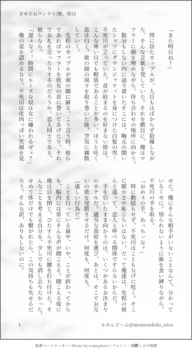 もめんどーふ☆quiet followDONEワンライ「暦、明日」リーマン?ぎゆさね未来ある明るい話を書こうと思ったのに、どうしてこうなった #ぎゆさね teethingRing show all(+4 images) Tap to full screen (size:618x1132).Repost is prohibited Let's send reactions! freqpopularsnackothersPayment processing Replies from the creator Follow creator you care about!☆quiet follow もめんどーふDONEフロセキュぎゆさねぎゆさね版ドロライ「雷雨、傘」と、その続きを纏めたものです※注意※下記の要素を含みます、苦手な方はご注意下さい・さねが体を売ってお金を稼いでいます・台詞だけですが、モブと絡んでいる描写があります・書いている本人はハッピーエンドのつもりですが、人によってはそう思わないかもしれません 13 もめんどーふDONEぎゆさね版ドロライ「体操、リズム」キメ学ぎゆさねある秋の日のひとこま 4 もめんどーふDONEぎゆさね版ドロライ「雷雨、傘」フロセキュぎゆさね雨宿りをする2人の話うっすらですが性行為描写あります、苦手な方はご注意ください 4 もめんどーふDONEキメ学ぎゆさね事後の話②(直球)割とどうしようもないくらいぎゆさんのことが好きなさね 4 もめんどーふDONEキメ学ぎゆさね事後の話(直球)ただたださねのことが大好きなぎゆさん 4 もめんどーふDONE現役ぎゆさね手合わせする2人の話 4 related works Kasumi KiriuDONE【ぎゆさね】2022ハロパロネタです🔞してやったりな北風🍃ちゃんがまんまとぎゆカサコに返り討ちにあうお話。全4P。後半🍌出ますので18歳未満閲覧禁止です× 4 Kasumi KiriuDONE【ぎゆさね】🔞18歳未満閲覧禁止原画展グッズののトミセンジャージが上下セットではなく上しかなかった事に端を発したネタです。勝手にセンシティブジャージと銘打っております。もろに出てますので18歳未満は閲覧禁止です× 3 Kasumi KiriuDOODLE【ぎゆさね】※18歳(高卒)未満閲覧禁止遅くなりましたが💦💦ホワイトデーポストで頂いた素敵なお返しをお題にして描きました😊ありがとうございました❣フロセキュぎゆさね🌊🍃勤務中に制服を着たままいたす2人。シチュなど苦手な方はスルーをお願いします🙇しっかりinしてます🍌背後注意⚠ Kasumi KiriuDONE【ぎゆさね】6月9日69の日ということで🍌描きたいとこだけ1ページ漫画です18歳未満閲覧禁止🈲 koketamaDOODLEねこちゃん🐱 きゃれみMENU新刊サンプルr-18部分です18歳以上ですか?(yes/no) 4 ymnkTRAINING練習ー koketamaDOODLEねこちゃん🐈⬛ i7_osk5DOODLEぎゆさねせっすす表情の練習 recommended works Kazu*🍃DONEシャーペン落書き🖋️してそのまま放置してたやつ…赤ブー支援に描けて良かったな❤️ 2 しかはねDONEワンライ「花見」(20210321)穏やか余生のはずがなにやら不穏 4 しかはねDONEワンライ「相談」(20210404)穏やか余生のはずがなにやら不穏ですがいたわりあって生きていてほしいぎゆさね+子猫の話。「花見」と同じ軸のつもり 7 しかはねDONEワンライお題「爪」仲良くお付き合いしてる体育教師×数学教師です。モブ男子生徒たちがニギヤカです。爪が剥がれたりしてます。大人げないセンセーになってしまう。(20210703) 11 もめんどーふDONEネタだけうっすら作ってたやつぶわっとやる気が出たうちに形にしましたキメ学ぎゆさねさねがじめっとしてるので、苦手な方はご注意下さい個人的には、ぎゆの前では割と弱ってたり甘えたりするさね、すきです追記:後日談も最後に入れました 9 もめんどーふDONEついろぐ漫画、なぎおかさん等、ごった煮 10 もめんどーふDONEひっそり続く結婚式シリーズ結婚前夜に各々の友人と語り合う話さねは出てこないけど、ぎゆさねです 3 もめんどーふDONEワンライ「職場(担当地区)、密会」DKぎゆさね、モブ女子の邪魔ありまとめきれないものを無理矢理まとめたらこうなったどうして… 5 もめんどーふDONEぎゆさね版ドロライ「団扇、風鈴」現役軸ぎゆさね手合わせ中に倒れちゃったさねの話1.0h 5