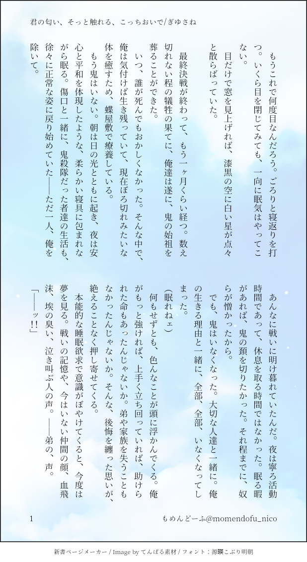 もめんどーふ☆quiet followDONEぼちライ39「君の匂い、そっと触れる、こっちおいで」余生ぎゆさね眠れないさねの話さねが少し後ろ向き1.75h足りなかったが、楽しく書けたのでヨシちょうどきりよく40で終われそうですね #ぎゆさね teethingRing show all(+5 images) Tap to full screen (size:618x1132).Repost is prohibited Let's send reactions! freqpopularsnackothersPayment processing Replies from the creator Follow creator you care about!☆quiet follow もめんどーふDONEぎゆさね版ドロライ「焼き鳥、しっぽり」DDぎゆさね2人きりで2次会する2人の話 4 もめんどーふDONE余生ぎゆさね心願成就を果たしたぎゆの話 5 もめんどーふDONE現役ぎゆさねワンライ「狩人、狼」の幕間ぎゆが気を失ってる間の話※少しですが流血描写があります。苦手な方はご注意ください 4 もめんどーふDONEぎゆさね版ドロライ「狩人、狼」現役ぎゆさねさねの救助に向かうぎゆさんの話※ご都合血鬼術が出てきます、苦手な方はご注意ください 5 もめんどーふDONEフロセキュぎゆさねぎゆさね版ドロライ「雷雨、傘」と、その続きのさらに続きの話※注意※下記の要素を含みます、苦手な方はご注意下さい・さねが体を売ってお金を稼いでいます・台詞だけですが、モブと絡んでいる描写があります 13 もめんどーふDONEフロセキュぎゆさねぎゆさね版ドロライ「雷雨、傘」と、その続きを纏めたものです※注意※下記の要素を含みます、苦手な方はご注意下さい・さねが体を売ってお金を稼いでいます・台詞だけですが、モブと絡んでいる描写があります・書いている本人はハッピーエンドのつもりですが、人によってはそう思わないかもしれません 13 related works Kasumi KiriuDONE【ぎゆさね】🔞18歳未満閲覧禁止原画展グッズののトミセンジャージが上下セットではなく上しかなかった事に端を発したネタです。勝手にセンシティブジャージと銘打っております。もろに出てますので18歳未満は閲覧禁止です× 3 i7_osk5DOODLEぎゆさねせっすす表情の練習 Kasumi KiriuDONE【ぎゆさね】2022ハロパロネタです🔞してやったりな北風🍃ちゃんがまんまとぎゆカサコに返り討ちにあうお話。全4P。後半🍌出ますので18歳未満閲覧禁止です× 4 koketamaDOODLEねこちゃん🐱 koketamaDOODLEねこちゃん🐈⬛ きゃれみMENU新刊サンプルr-18部分です18歳以上ですか?(yes/no) 4 Kasumi KiriuDONE【ぎゆさね】6月9日69の日ということで🍌描きたいとこだけ1ページ漫画です18歳未満閲覧禁止🈲 Kasumi KiriuDOODLE【ぎゆさね】※18歳(高卒)未満閲覧禁止遅くなりましたが💦💦ホワイトデーポストで頂いた素敵なお返しをお題にして描きました😊ありがとうございました❣フロセキュぎゆさね🌊🍃勤務中に制服を着たままいたす2人。シチュなど苦手な方はスルーをお願いします🙇しっかりinしてます🍌背後注意⚠ ymnkTRAINING練習ー recommended works しかはねDONEワンライ「ありがとう」(20210327)DK同級生ぎゆさね 5 しかはねDONEワンライ「○○は見た」(20210410)穏やか余生だけどいまいち不穏な日々ぎゆさね。しづママは長男が長女だったらよかったのに…て思ってるかもしれないという気がしてしまっている。 3 もめんどーふDONEなにか昂ったタイミングで作った小話のまとめいろんな時間軸ごった煮です 4 ramozzgisaTRAININGちゅう練習。構図は模写。 もめんどーふDONEぼちぼちかいてたやつ原作軸、柱ぎゆと隊士さねさねの回想的なお話ですよろしければ、どうぞ 9 もめんどーふDONEワンライ「わがまま、ご機嫌取り」①キメ学少し女々しいさねがいます、注意 5 もめんどーふDONEワンライ「100」リーマンぎゆさねのつもり100と聞いてまず浮かんだのがバラの花束だったベタだなぁ 5 snmnohgDONEぎゆせん.せーを誘惑しようとするDKさね。さねしかいないけどぎゆさねです。🍑がちらりしてます。 もめんどーふDONEキメ学ぎゆさね酔っぱらいさねが色々はっちゃける話なんかすごく気楽に書けて楽しかったですまる 3
