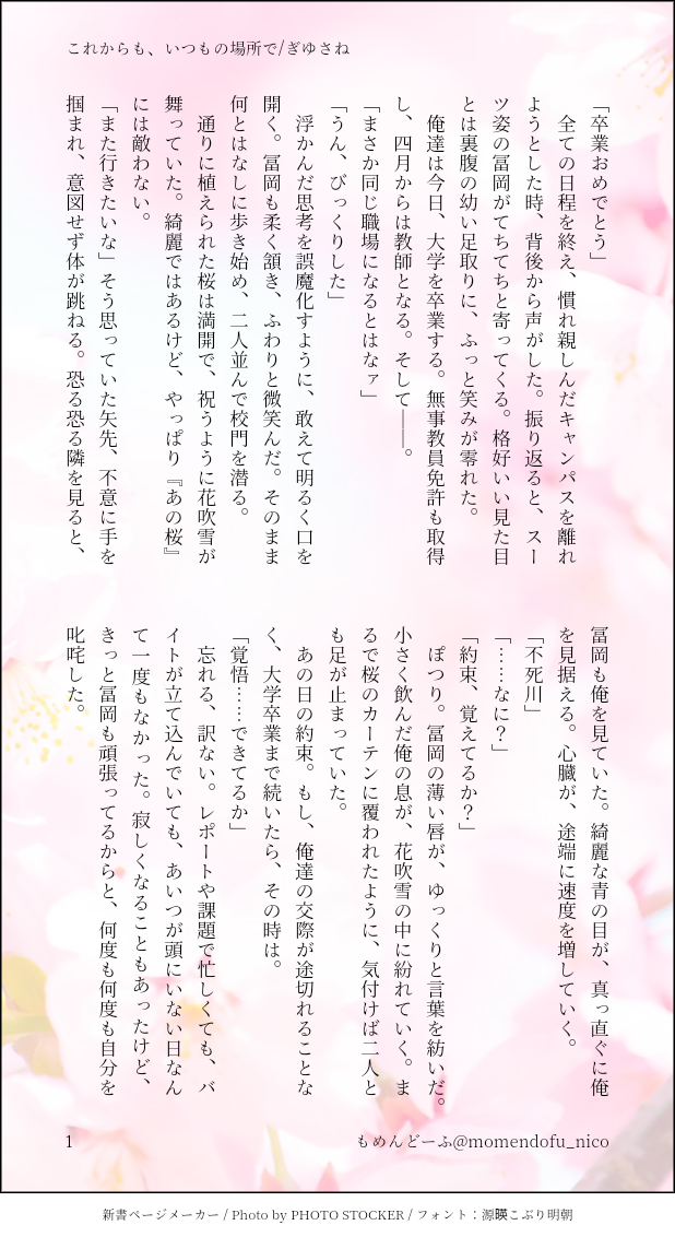 もめんどーふ☆quiet followDONEワンライ「雪解け、花吹雪」のその後2人なら、こんな結末を迎えられるんじゃないかと願望かもしれないけどさっと書くつもりが、だらだらしてしまった #ぎゆさね teethingRing show all(+2 images) Tap to full screen (size:618x1132).Repost is prohibited Let's send reactions! freqpopularsnackothersPayment processing Replies from the creator Follow creator you care about!☆quiet follow もめんどーふDONEぎゆさね版ドロライ「焼き鳥、しっぽり」DDぎゆさね2人きりで2次会する2人の話 4 もめんどーふDONE余生ぎゆさね心願成就を果たしたぎゆの話 5 もめんどーふDONE現役ぎゆさねワンライ「狩人、狼」の幕間ぎゆが気を失ってる間の話※少しですが流血描写があります。苦手な方はご注意ください 4 もめんどーふDONEぎゆさね版ドロライ「狩人、狼」現役ぎゆさねさねの救助に向かうぎゆさんの話※ご都合血鬼術が出てきます、苦手な方はご注意ください 5 もめんどーふDONEフロセキュぎゆさねぎゆさね版ドロライ「雷雨、傘」と、その続きのさらに続きの話※注意※下記の要素を含みます、苦手な方はご注意下さい・さねが体を売ってお金を稼いでいます・台詞だけですが、モブと絡んでいる描写があります 13 もめんどーふDONEフロセキュぎゆさねぎゆさね版ドロライ「雷雨、傘」と、その続きを纏めたものです※注意※下記の要素を含みます、苦手な方はご注意下さい・さねが体を売ってお金を稼いでいます・台詞だけですが、モブと絡んでいる描写があります・書いている本人はハッピーエンドのつもりですが、人によってはそう思わないかもしれません 13 related works Kasumi KiriuDOODLE【ぎゆさね】※18歳(高卒)未満閲覧禁止遅くなりましたが💦💦ホワイトデーポストで頂いた素敵なお返しをお題にして描きました😊ありがとうございました❣フロセキュぎゆさね🌊🍃勤務中に制服を着たままいたす2人。シチュなど苦手な方はスルーをお願いします🙇しっかりinしてます🍌背後注意⚠ koketamaDOODLEねこちゃん🐈⬛ ymnkTRAINING練習ー Kasumi KiriuDONE【ぎゆさね】2022ハロパロネタです🔞してやったりな北風🍃ちゃんがまんまとぎゆカサコに返り討ちにあうお話。全4P。後半🍌出ますので18歳未満閲覧禁止です× 4 koketamaDOODLEねこちゃん🐱 i7_osk5DOODLEぎゆさねせっすす表情の練習 Kasumi KiriuDONE【ぎゆさね】🔞18歳未満閲覧禁止原画展グッズののトミセンジャージが上下セットではなく上しかなかった事に端を発したネタです。勝手にセンシティブジャージと銘打っております。もろに出てますので18歳未満は閲覧禁止です× 3 きゃれみMENU新刊サンプルr-18部分です18歳以上ですか?(yes/no) 4 Kasumi KiriuDONE【ぎゆさね】6月9日69の日ということで🍌描きたいとこだけ1ページ漫画です18歳未満閲覧禁止🈲 recommended works もめんどーふDONEワンライ:公園、昼食できてねぇDKぎゆさね久し振りにワンライらしい感じになった気がする。展開がソードマスターヤマトだけどorz今みたらちょっと書き加えたくなるけどorz界隈で良くみる設定「さねは家事上手」。まだそうなる前をかきたかった(願望) 5 もめんどーふDONEワンライのお題だけ借りた「薔薇、内緒」ガス欠起こしてて人のが読めないし、自分でも書けない折角素敵なお題なのにな 2 emamama925PAST18歳以上(高校生不可)のフォロワーさん限定です。yes/no 17 ramozzgisaDONEお題【舌を出して●●を求めるさね】●●はひねれなかった・・・ もめんどーふDONE胸につかえた何かを吐き出したくてかいたものキメ学ぎゆさね結婚式(オンリー)まで数日のお話 4 もめんどーふDONEこの前のバレンタイン話のつづきDKぎゆさね少し含みを持たせる話にしたかった(願望) 5 もめんどーふREHABILI現パロぎゆさね🐹のホワイトデー撮影後に家でのんびりする話衝動に駆られてばーっとかいた後悔も反省もしていないのべつまくなしすいこうはあとまわし(いつもの) 4 taku0417gsDOODLE女体化しなずがわさん逆バニーぎゆさね♀ もめんどーふDONEぎゆさね版ドロライ「溜息、深呼吸」フロセキュぎゆさね好きだから嫌いなお前の話1.0h展開が新幹線4枚に纏められたのはよかったと思う 4
