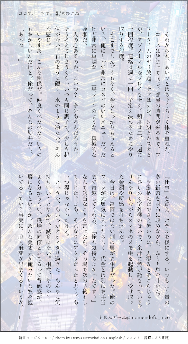 もめんどーふ☆quiet followDONEフロセキュぎゆさね体を売ってるさねと、買ってるぎゆの話②2人とも不特定多数と遊んでるモブとの行為匂わせ描写あり苦手な方はご注意下さい多分全部で6話くらいになりそう #ぎゆさね teethingRing show all(+6 images) Tap to full screen (size:618x1132).Repost is prohibited Let's send reactions! freqpopularsnackothersPayment processing Replies from the creator Follow creator you care about!☆quiet follow もめんどーふDONEぎゆさね版ドロライ「焼き鳥、しっぽり」DDぎゆさね2人きりで2次会する2人の話 4 もめんどーふDONE余生ぎゆさね心願成就を果たしたぎゆの話 5 もめんどーふDONE現役ぎゆさねワンライ「狩人、狼」の幕間ぎゆが気を失ってる間の話※少しですが流血描写があります。苦手な方はご注意ください 4 もめんどーふDONEぎゆさね版ドロライ「狩人、狼」現役ぎゆさねさねの救助に向かうぎゆさんの話※ご都合血鬼術が出てきます、苦手な方はご注意ください 5 もめんどーふDONEフロセキュぎゆさねぎゆさね版ドロライ「雷雨、傘」と、その続きのさらに続きの話※注意※下記の要素を含みます、苦手な方はご注意下さい・さねが体を売ってお金を稼いでいます・台詞だけですが、モブと絡んでいる描写があります 13 もめんどーふDONEフロセキュぎゆさねぎゆさね版ドロライ「雷雨、傘」と、その続きを纏めたものです※注意※下記の要素を含みます、苦手な方はご注意下さい・さねが体を売ってお金を稼いでいます・台詞だけですが、モブと絡んでいる描写があります・書いている本人はハッピーエンドのつもりですが、人によってはそう思わないかもしれません 13 related works koketamaDOODLEねこちゃん🐈⬛ Kasumi KiriuDOODLE【ぎゆさね】※18歳(高卒)未満閲覧禁止遅くなりましたが💦💦ホワイトデーポストで頂いた素敵なお返しをお題にして描きました😊ありがとうございました❣フロセキュぎゆさね🌊🍃勤務中に制服を着たままいたす2人。シチュなど苦手な方はスルーをお願いします🙇しっかりinしてます🍌背後注意⚠ Kasumi KiriuDONE【ぎゆさね】🔞18歳未満閲覧禁止原画展グッズののトミセンジャージが上下セットではなく上しかなかった事に端を発したネタです。勝手にセンシティブジャージと銘打っております。もろに出てますので18歳未満は閲覧禁止です× 3 Kasumi KiriuDONE【ぎゆさね】2022ハロパロネタです🔞してやったりな北風🍃ちゃんがまんまとぎゆカサコに返り討ちにあうお話。全4P。後半🍌出ますので18歳未満閲覧禁止です× 4 i7_osk5DOODLEぎゆさねせっすす表情の練習 きゃれみMENU新刊サンプルr-18部分です18歳以上ですか?(yes/no) 4 Kasumi KiriuDONE【ぎゆさね】6月9日69の日ということで🍌描きたいとこだけ1ページ漫画です18歳未満閲覧禁止🈲 koketamaDOODLEねこちゃん🐱 ymnkTRAINING練習ー recommended works もめんどーふTRAININGきちんとペン入れとか色塗りをしたいなぁ(´・ω・`) 2 しかはねDONEワンライ「雨音」(20210417)余生、事後です。 4 mainichinemuichDONE相互さんのツイートがあまりに解釈一致だったのでネタをお借りしました。※ご本人に掲載許可いただいています!ありがとうございます!※すけべはありません!ギャグです!弊イデアズにおいても性欲は🐙の方が溜めがち(小出しの発散方法が分からない)だと思っているので、「🐙ちゃんは爆発力がすごくて、スイッチ入ったら野生が目覚めてしまい大変そう」という呟きに飛びついちゃいましたね。(そうですか) 2 satouankou0383DOODLEParanormal crime2 ラブアンドデストロイ全話バレですパスワードは0話時点のシルバーの年齢 2 もめんどーふDONEぎゆさね版ドロライ「溜息、深呼吸」フロセキュぎゆさね好きだから嫌いなお前の話1.0h展開が新幹線4枚に纏められたのはよかったと思う 4 もめんどーふDONEぎゆさね版ドロライ「弱点、お互い様」DDぎゆさねさねの弱点が気になるぎゆの話1.0h久々にすらすらできた気がする 4 もめんどーふDONEぎゆさね版ドロライ「旅立ち、心残り」原作軸ぎゆさね弔うぎゆとそれを見届けるさねの話1.0h 4 もめんどーふDONEぎゆさね版ドロライ「予感、鈍感」DKぎゆさね憎らしいほど鈍いあいつの話信じられないほど鈍いぎゆくっつかない1.15h切ないやつにしたかった 4 nami_gysnSPUR ME🆕夕凪時に薫る風2️⃣ぎゆさね×猫犬柱の日常編です今後少しずつ追加していきたいと思ってます 4