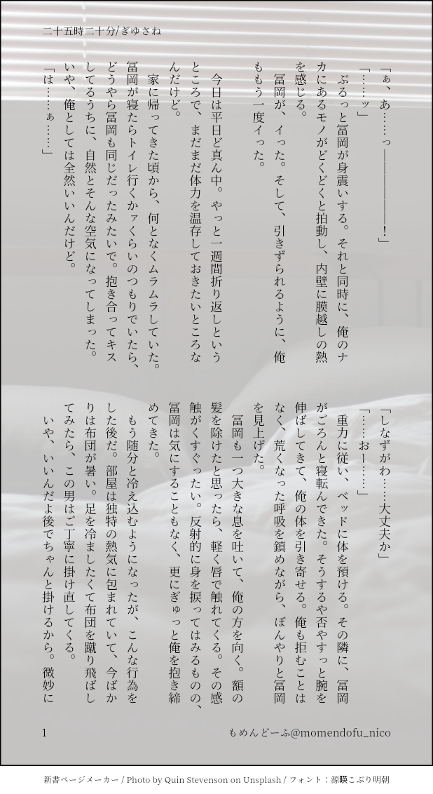 もめんどーふ☆quiet followDONEキメ学ぎゆさね事後の話(全年齢)ワンライの代わりに書いたこなれた雰囲気難しい #ぎゆさね teethingRing show all(+3 images) Tap to full screen (size:618x1132).Repost is prohibited Let's send reactions! freqpopularsnackothersPayment processing Replies from the creator Follow creator you care about!☆quiet follow もめんどーふDONEぎゆさね版ドロライ「焼き鳥、しっぽり」DDぎゆさね2人きりで2次会する2人の話 4 もめんどーふDONE余生ぎゆさね心願成就を果たしたぎゆの話 5 もめんどーふDONE現役ぎゆさねワンライ「狩人、狼」の幕間ぎゆが気を失ってる間の話※少しですが流血描写があります。苦手な方はご注意ください 4 もめんどーふDONEぎゆさね版ドロライ「狩人、狼」現役ぎゆさねさねの救助に向かうぎゆさんの話※ご都合血鬼術が出てきます、苦手な方はご注意ください 5 もめんどーふDONEフロセキュぎゆさねぎゆさね版ドロライ「雷雨、傘」と、その続きのさらに続きの話※注意※下記の要素を含みます、苦手な方はご注意下さい・さねが体を売ってお金を稼いでいます・台詞だけですが、モブと絡んでいる描写があります 13 もめんどーふDONEフロセキュぎゆさねぎゆさね版ドロライ「雷雨、傘」と、その続きを纏めたものです※注意※下記の要素を含みます、苦手な方はご注意下さい・さねが体を売ってお金を稼いでいます・台詞だけですが、モブと絡んでいる描写があります・書いている本人はハッピーエンドのつもりですが、人によってはそう思わないかもしれません 13 related works Kasumi KiriuDOODLE【ぎゆさね】※18歳(高卒)未満閲覧禁止遅くなりましたが💦💦ホワイトデーポストで頂いた素敵なお返しをお題にして描きました😊ありがとうございました❣フロセキュぎゆさね🌊🍃勤務中に制服を着たままいたす2人。シチュなど苦手な方はスルーをお願いします🙇しっかりinしてます🍌背後注意⚠ koketamaDOODLEねこちゃん🐈⬛ Kasumi KiriuDONE【ぎゆさね】6月9日69の日ということで🍌描きたいとこだけ1ページ漫画です18歳未満閲覧禁止🈲 koketamaDOODLEねこちゃん🐱 きゃれみMENU新刊サンプルr-18部分です18歳以上ですか?(yes/no) 4 Kasumi KiriuDONE【ぎゆさね】2022ハロパロネタです🔞してやったりな北風🍃ちゃんがまんまとぎゆカサコに返り討ちにあうお話。全4P。後半🍌出ますので18歳未満閲覧禁止です× 4 Kasumi KiriuDONE【ぎゆさね】🔞18歳未満閲覧禁止原画展グッズののトミセンジャージが上下セットではなく上しかなかった事に端を発したネタです。勝手にセンシティブジャージと銘打っております。もろに出てますので18歳未満は閲覧禁止です× 3 i7_osk5DOODLEぎゆさねせっすす表情の練習 ymnkTRAINING練習ー