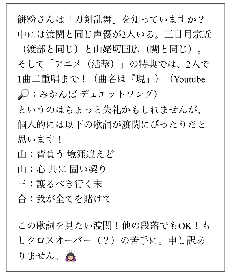 餅粉。☆quiet followDONEお題箱より。「現」を歌うわたせきでOKとメッセージを頂いたのでカラオケで歌ってもらいました。2枚目は初めてクロスオーバーを描いたのでその時に色々考えた妄想です。 show all(+2 images) Tap to full screen (size:1170x1399).Repost is prohibited 餅粉。DOODLE今年も宜しくお願いいたします⛄️ 餅粉。DOODLE8thすたぱわたせき漫画。これまでのすたぱカードのわたせきがわちゃわちゃしてるので注意。 8 餅粉。DONEお題箱より。2枚目はおまけの幻覚強めの妄想です。お題を有難うございました! 3 餅粉。DONEお題箱より。衣装の構造が分からないところは何となくで描いてます。2枚目は色々妄想した絵です。お題を有難うございました! 3 餅粉。DOODLE本年も宜しくお願い致します🐉 3 餅粉。DONEお題箱より。「現」を歌うわたせきでOKとメッセージを頂いたのでカラオケで歌ってもらいました。2枚目は初めてクロスオーバーを描いたのでその時に色々考えた妄想です。 3