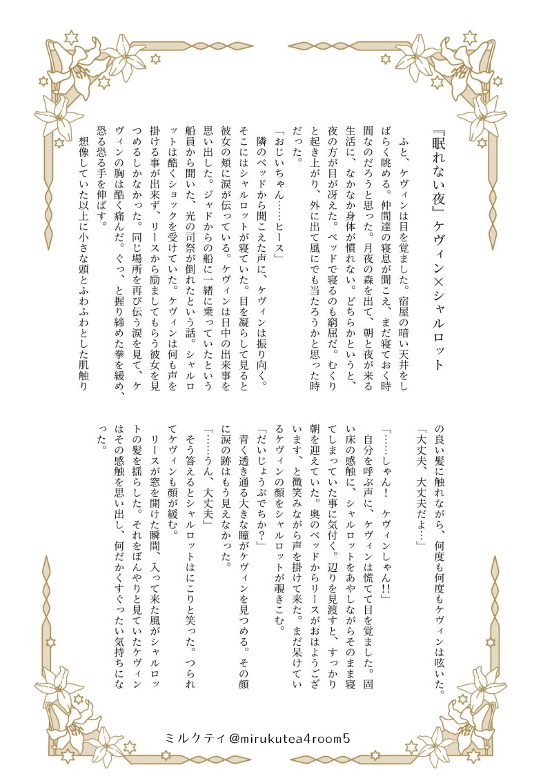 ミルクティ☆quiet followDONEマナフェス!合同ネップリ印刷有り難うございました。ケヴィシャル「眠れない夜」お題メーカーさんから考えました。2021.7/31-8/1 Tap to full screen (size:1748x2481).Repost is prohibited ミルクティDONEホークリ60分お題 2021.12.12大地の裂け目シャルロット視線旅の間だったかな? 2 ミルクティDONE2021.9.12ホークリ「澄空」光の古代遺跡が楽しそうなホークアイ見てて書きたくなりました。ドリアンでも楽しそうですよね。神獣見て宝石の神獣ダァーみたいな事言ってませんでしたかね?デュランに怒られてそう。 7 ミルクティDONEマナフェス!合同ネップリペーパー印刷有り難うございました。デュラアン「炎」ホークリ「夜這星」悩める男子的な作品になりました。2021.7/31-8/1 2 ミルクティDONEマナフェス!合同ネップリ印刷有り難うございました。ケヴィシャル「眠れない夜」お題メーカーさんから考えました。2021.7/31-8/1 ミルクティDONE「少女と帽子」2021.5.18 2 ミルクティDONEデュラアン『わたしの初恋』一人称で書いてみました。楽しかった。アンジェラって恋愛に対して憧れとかありそうだなーと思って。 3 recommended works mayamayapppDOODLEふいうち(付き合ってる侑日)私の脳内のヒナタはそんなに好き好き言わないんだけど、気持ちが溜まってきたときに突然言うから、ふいうちでツムが爆発する 朝暮夕DOODLE[新风]色色可以色色 小SylvieDOODLE火焰戎装番外 7 arigatona101DOODLE隣でくにちょぎされて、たまらない二振り目の憂鬱 ひのちDONE #宇受バニー強化週間👯♀️強化週間、29日までセンiシチiブはポイに掲載します!👯♀️💎さんです。かなり肌i露出iしてるのでダメな人は回れ右で⚠️合言葉はいつもの!18以上、Y or N? 3 tuuuuuri_02DOODLE됐당러트인ㄷㅔ오늘부터수련회이슈 蓮くんDOODLEモブピケ(そんなえちくない) yudetamachanINFO過去フォトのアップロードができなくなりました。今後はTwitterなどにペタペタ貼っていこうと考えてます。 20 ooe_1025DOODLE大崎のASMRを聞くことになった青海先生エロくないけど内容が内容なのでワンク