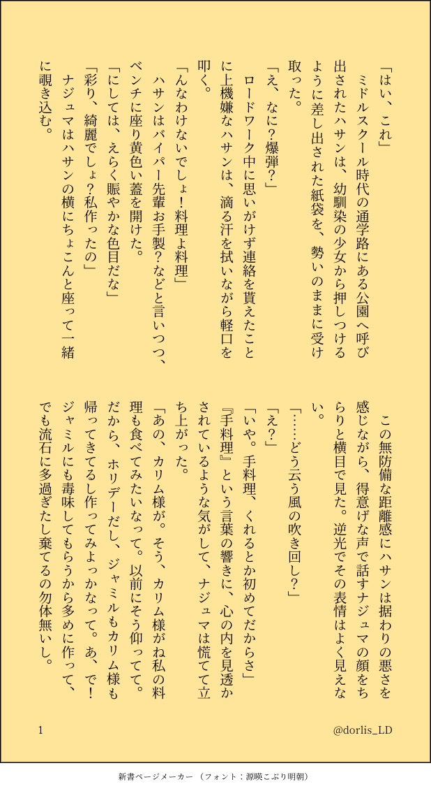 ドーリス☆quiet followMOURNING人様の作品(https://twitter.com/wine_oishiine/status/1479419963815641093?s=21&t=szV23qjUdxZpirtYxau44g)を読み、そこから妄想を膨らませた三次創作(本人様にTwitter掲載許可を頂いてます) show all(+2 images) Tap to full screen (size:618x1132).Repost is prohibited ドーリスMOURNINGハロウィン時期にXに上げた、オンボロ寮のゴーストが語り部的なおはなし 6 ドーリスMOURNINGハロウィン時期にXで上げたtwst話。スカリーくんと西校舎廊下にいる彼女が会話しているだけのおはなし 6 ドーリスMOURNING2023.11.22にX上にて開催された『1122crmz会』というクルモゼ企画に参加させて頂いたお話です。 3 ドーリスMOURNINGハーツラビュルで開催されている、なんでもない日のパーティーが、なんでもないわけでもないパーティーのこともあるかもしれない、という妄想を、創作モブ寮生目線から書いたおはなし。※この主人公のオーキッド・エヴァンスはビーンズデイ前夜に無理矢理バイオリンを弾かされていた猫の獣人族のコです。 5 ドーリスMOURNING学食のオバチャン企画(2023.2.14〜2.22開催)に参加させて頂いた折に書いたものたち。 23 ドーリスMOURNING二次創作ニアラズ 2 recommended works ドーリスDONEクレカルさま主催のホラー企画、「世にも奇妙な#NRCの七不思議」に参加させていただきました。これ、ホラーと呼べるか?な作品ですが読んで頂けたら嬉しいです。 15 ドーリスMOURNINGホラー企画「世にも奇妙な#NRCの七不思議」に参加した際に書いた「やみだまり」との連投作品。すからモブ寮生(名前付けてます)が主人公。 3 ドーリスMOURNINGホラー企画、「世にも奇妙な#NRCの七不思議」に参加した際に書いた「やみだまり」との連投作品。こちらはホラー要素なし。学園長とサムさんのお話です。 3 ドーリスDONE絨毯がジャミルの誕生日を祝いたいなぁと思うお話です。 10 朝暮夕DOODLE[新风]色色可以色色 yottsunomaruDOODLEDOGS二次🌈です。初夢まんがあけましておめでとう見てくださりありがとうございます!の絵②矢島くんの独占欲も見たい😋🍴110番の日 5 piMdoriCMOURNING描いた後この顔しないかなと思ったので供養… マシェリPAST2024のトリッシュ誕 yyyDOODLE[archive] bottom jiyan (wuwa) 9