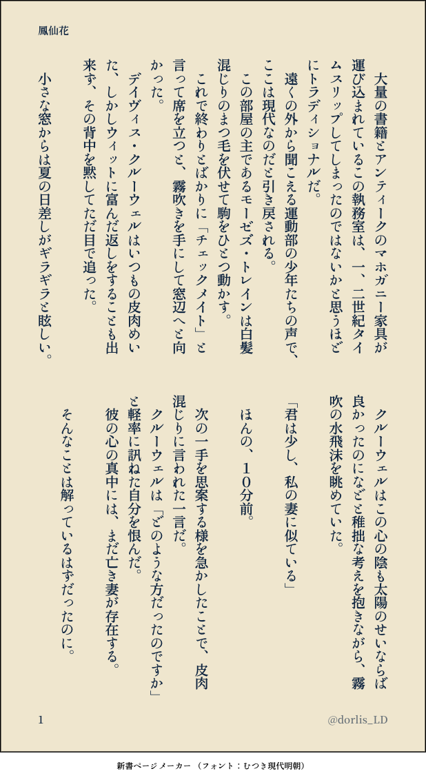 ドーリス☆quiet followMOURNING📚⚗️がチェスしながら痛みを伴う思い出話をしているお話。 show all(+5 images) Tap to full screen (size:618x1132).Repost is prohibited ドーリスMOURNINGハロウィン時期にXに上げた、オンボロ寮のゴーストが語り部的なおはなし 6 ドーリスMOURNINGハロウィン時期にXで上げたtwst話。スカリーくんと西校舎廊下にいる彼女が会話しているだけのおはなし 6 ドーリスMOURNING2023.11.22にX上にて開催された『1122crmz会』というクルモゼ企画に参加させて頂いたお話です。 3 ドーリスMOURNINGハーツラビュルで開催されている、なんでもない日のパーティーが、なんでもないわけでもないパーティーのこともあるかもしれない、という妄想を、創作モブ寮生目線から書いたおはなし。※この主人公のオーキッド・エヴァンスはビーンズデイ前夜に無理矢理バイオリンを弾かされていた猫の獣人族のコです。 5 ドーリスMOURNING学食のオバチャン企画(2023.2.14〜2.22開催)に参加させて頂いた折に書いたものたち。 23 ドーリスMOURNING二次創作ニアラズ 2 recommended works ドーリスDONEクレカルさま主催のホラー企画、「世にも奇妙な#NRCの七不思議」に参加させていただきました。これ、ホラーと呼べるか?な作品ですが読んで頂けたら嬉しいです。 15 ドーリスMOURNINGホラー企画「世にも奇妙な#NRCの七不思議」に参加した際に書いた「やみだまり」との連投作品。すからモブ寮生(名前付けてます)が主人公。 3 ドーリスMOURNINGホラー企画、「世にも奇妙な#NRCの七不思議」に参加した際に書いた「やみだまり」との連投作品。こちらはホラー要素なし。学園長とサムさんのお話です。 3 ドーリスDONE絨毯がジャミルの誕生日を祝いたいなぁと思うお話です。 10 ¥つまDONEこれは朝家を出る前に殴り合いの喧嘩をする善獪善です私の性癖にしか配慮していません!! NIKAIkitDOODLEARCANA HO2 まとめ 12 dakenisdogDOODLEラ ただの人体練習 NauraSweetaruDOODLE マシェリPAST2024のトリッシュ誕
