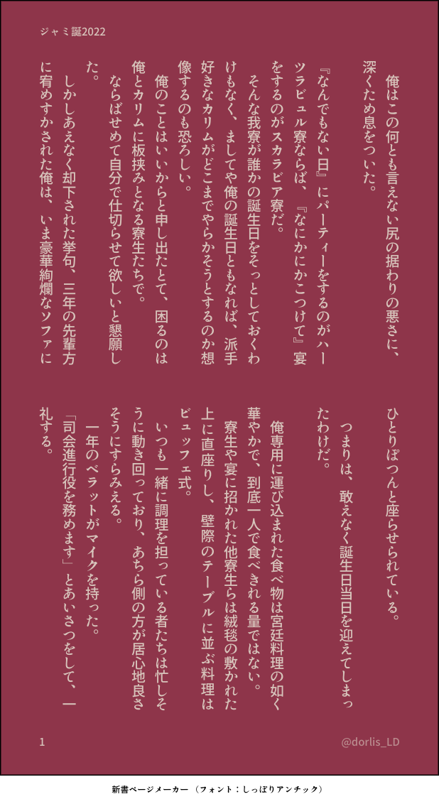 ドーリス☆quiet followMOURNINGジャミ誕。とっても短い。 show all(+3 images) Tap to full screen (size:618x1132).Repost is prohibited ドーリスMOURNINGハロウィン時期にXに上げた、オンボロ寮のゴーストが語り部的なおはなし 6 ドーリスMOURNINGハロウィン時期にXで上げたtwst話。スカリーくんと西校舎廊下にいる彼女が会話しているだけのおはなし 6 ドーリスMOURNING2023.11.22にX上にて開催された『1122crmz会』というクルモゼ企画に参加させて頂いたお話です。 3 ドーリスMOURNINGハーツラビュルで開催されている、なんでもない日のパーティーが、なんでもないわけでもないパーティーのこともあるかもしれない、という妄想を、創作モブ寮生目線から書いたおはなし。※この主人公のオーキッド・エヴァンスはビーンズデイ前夜に無理矢理バイオリンを弾かされていた猫の獣人族のコです。 5 ドーリスMOURNING学食のオバチャン企画(2023.2.14〜2.22開催)に参加させて頂いた折に書いたものたち。 23 ドーリスMOURNING二次創作ニアラズ 2 recommended works 牛乳🐄TRAINING肌を塗って力つきました18↑?yes/no 2 ドーリスDONEクレカルさま主催のホラー企画、「世にも奇妙な#NRCの七不思議」に参加させていただきました。これ、ホラーと呼べるか?な作品ですが読んで頂けたら嬉しいです。 15 ドーリスMOURNINGホラー企画「世にも奇妙な#NRCの七不思議」に参加した際に書いた「やみだまり」との連投作品。すからモブ寮生(名前付けてます)が主人公。 3 ドーリスMOURNINGホラー企画、「世にも奇妙な#NRCの七不思議」に参加した際に書いた「やみだまり」との連投作品。こちらはホラー要素なし。学園長とサムさんのお話です。 3 ドーリスDONE絨毯がジャミルの誕生日を祝いたいなぁと思うお話です。 10 畑耕しマンDOODLE💙青いお兄さん💙 O+RRRDOODLE 4 yyyDOODLE[archive] bottom lighter stuff, etc 5 あまおうDONEさくらんぼのヘタ結ぶやつ幾成じょうずだね