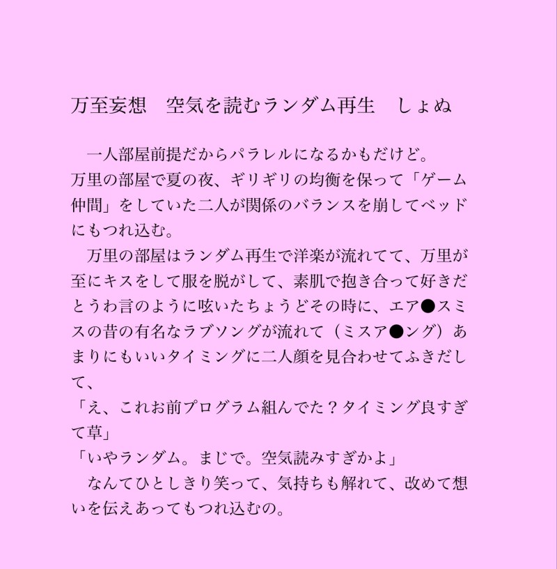 しょぬ☆quiet followMEMO万至妄想🌸空気読むランダム再生ってあるよね、ていう話。エア●スミスのミス●シ●グは和訳が死ぬほど甘い恋の歌なので知らない方は是非ググって頂きたい。万里の一人部屋は革張りのソファベッドとかありそう。夏の暑い夜、暑いの苦手なんだけど、とか言いながら至さんも熱にうかされてくれ。 ##万至妄想 Tap to full screen (size:1448x1477).Repost is prohibited Let's send reactions! freqpopularsnackothersPayment processing Replies from the creator Follow creator you care about!☆quiet follow しょぬDONEFor SEASONS Blooming! 展示作品でした。高校生万里×教師至の、万里→至。春休み最後の日曜日のお話です。じれったくて少し背徳的で、熱に浮かされた若い恋。 8 しょぬDONE摂津ファミリー日記③のノベルティミニ本「至れべあげ日記」です。本文ネタバレ含みますので、本文読了後をお勧めします。特典付が早期完売につき、画像にて公開します。本がお手元に届いてからパスワードを調べて打ち込んでください。(パスワードの答えは内緒でお願いしますね)PASS→P72 〇〇〇〇のポシェット(ローマ字8字) + キャップの色を英語で 37 しょぬDOODLE【五伏】その腕の中、朽ち果てられたならば。五をめぐがあまやかす夜もあるのかなって妄想です。原作未履修につき理解浅かったらすいません。全2ページ短め。 2 しょぬMOURNING #摂津ファミリー日記思春期編。小説ではなく妄想語りです。たるちメイン、中学生です。公開するつもりなかったんですけど、なんとなく。こんな時期を経て、たるちの反抗期はおさまり、改名も言わなくなっていきます。 3 しょぬDONE摂津ファミリー日記、双子のいたずら編です。コスメとチビ達といえば、これかなと。パスは、「スペナンバー(ひらがな→アルファベットへ)」と「スペースにて無配リンクが置いてあった位置(向かって左から〇番目の〇に入る数字)」を続けて。計3文字。 8 しょぬPAST大昔に書いた堕天もののSSです。オリジナル作品なので一次創作用の名前も入っていますがスルーしてください。こういった筋はいつだって心に刺さるんです…私的には…。 7