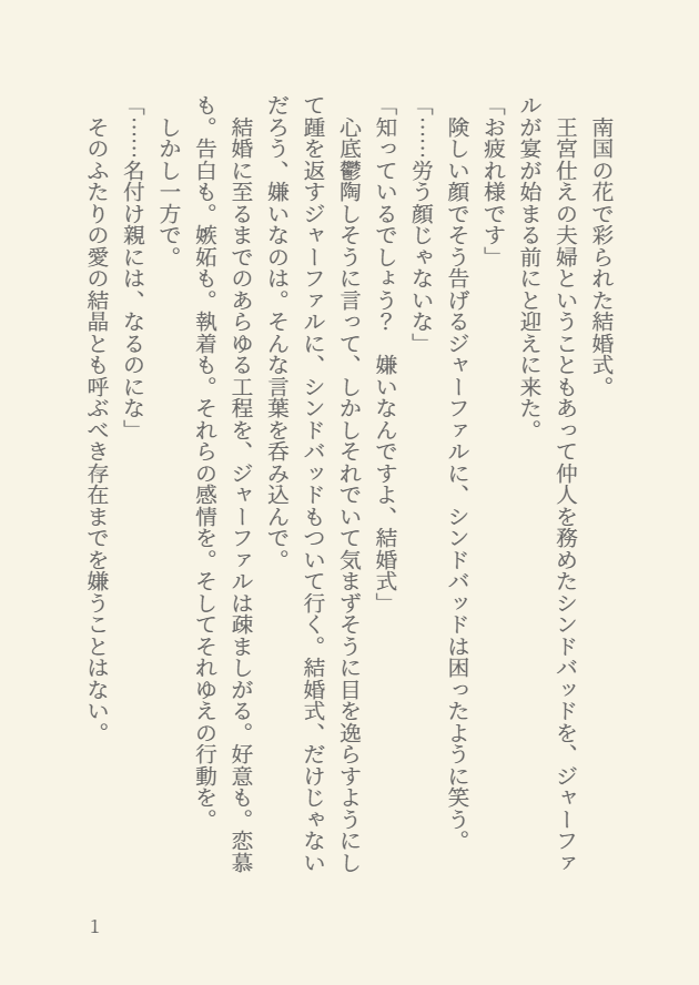 ゆすはら☆quiet followCAN’T MAKE愛が嫌いなジャーファルのシンジャ。(もっと書くつもりだったけど力尽きた。) #シンジャ thinja show all(+3 images) Tap to full screen (size:630x888).Repost is prohibited Let's send reactions! freqpopularsnackothersPayment processing Replies from the creator Follow creator you care about!☆quiet follow ゆすはらDOODLEキスの日に書こうとした話だというのは信じてくれなくて大丈夫です。 6 ゆすはらDOODLE「果ての楽園」という本のシンジャのその後の唐突な短編。~読んでない方のための雑なあらすじ~転生現パロオメガバシンジャ。やっとのことで番になった。ジャーファルは卑屈で病弱だったけど改善しつつある。シン様の過保護で過度な心配性に改善は見られない。 7 ゆすはらMOURNINGhttps://www.pixiv.net/novel/show.php?id=20843149の(最後の話のその後の)おまけ~ 7 ゆすはらDOODLEカプなし。シンドバッドとジャーファルとマスルールの話。何でもじゃなくていいけどいろいろ許せる方向け。 4 ゆすはらDOODLEやらしい話をしているシンジャのやらしくない話。あさちゅんと言い張る。 9 ゆすはらDONEシャルルカン目線シンジャ 7 related works savi_viviPROGRESSラフ。差分をどうするか考えている。趣味全開。前にだしたdom/subユニバースの本のあれです。 makulakamakulaINFO「あの日の約束」ご飯アンソロで書かせていただいた小説のその後SSです。今の時世が反映されている内容なので苦手な方は無理に読まなくて大丈夫です。パスワードは当日私を捕まえていただけたらと思います。 6 savi_viviDONE秋のご挨拶。昨年末に出したただの薄いスケベブック「IN THE UNIVERSE OF 14 LETTERS」時空の現パロかつDom/Sub ユニバースパロシンジャです。 苔@kokeampkPAST以前Twitterで乗せた子シン子ジャ♀です。 苔@kokeampkDOODLEパソコン内に下書きだけされて放置されていた現パロの子シン子ジャ♀の漫画を見つけたので線画だけ書いてみました。台詞が抜けていて何を描こうとしていたのか思い出せず…。多分母の日だと思われるのですが…思い出せたら続きかきます。。 おとなしDONEシンドバッド少年が夢をきっかけに悶々としている話の後編。R18パスワード【あなたは十八歳以上ですか?】yes or no で回答の上どうぞ。作品内に倫理的に問題のある描写がありますがそれらの行為を推奨するものではありません。 7058 kokumin06DONE現パロシンジャ先生と生徒もの kokumin06MOURNING出来てないけど一緒に寝てるシンジャ漫画 kbktea_jaDOODLEシンジャ漫画【邪魔者】※性描写あるので閲覧注意 3 recommended works ココノPAST夏のシンとジャ仮倉庫としてはじめました 苔@kokeampkPAST以前とある方より2次創作の小説表紙用にご依頼を頂いて描いたシンジャ(子ジャ)イラストです。 苔@kokeampkDOODLE子ジャという名の黒歴史を前にするジャーファルさん kbktea_jaDOODLEクリームソーダみたいな恋をして/現パロ おとなしDONE続きものです。タイトルは仮です。二度目の建国からちょいあとくらい。 3450 makulakamakulaMAIKING帰還後、ジャとの結婚を思いつきさりげなくアピールするシンと、お約束みたいに気付いてくれないジャの話……になったらいいなと思う。当然のようにマスが、その他大勢が巻き込まれるかもしれません。 michi93chuuPAST女の秘め事/いいふうふのひ/背比べ/あいのことばよりあつい/子どもは子どもの都合で動いている/もふもふ/花の落ちる音を聞いた/ ※捏造設定多め(2011/11/19〜2011/12/11) 89 michi93chuuPASTうつくしきひと/種をまく人々/追いつけ追い越せ/ただ、今を交わす/我ら幸せ配達人!/あなたと私から始まる/月夜の2人/白と黒の狭間/えあいんて!/(2011/12/15〜2012/01/07 pixivより再掲) 102 Ettoet_SinJaDOODLEIdkPass: the couple 's name 4