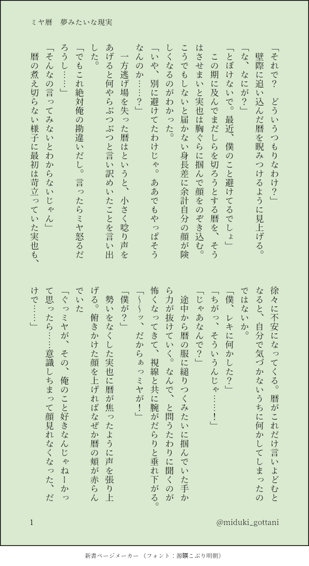 miduki_gottani☆quiet followMOURNINGミヤ暦本に書き下ろした「それがたとえ夢だとしても」のその後のつもりで書いたもののいまいち纏まらなくてボツにした話。 show all(+3 images) Tap to full screen (size:618x1132).Repost is prohibited Let's send reactions! freqpopularsnackothersPayment processing Replies from the creator Follow creator you care about!☆quiet follow miduki_gottaniMOURNINGミヤ暦本に書き下ろした「それがたとえ夢だとしても」のその後のつもりで書いたもののいまいち纏まらなくてボツにした話。 4 miduki_gottaniMOURNING学パロ幼なじみ設定なばちいさバレンタイン。ばちらくんに「いさぎはどれがいい?」って言わせたかっただけという、自分で書いててよくわからなくなってしまったものの残骸。突貫で書いたのでいろいろ雑 2600 miduki_gottaniMOURNINGpixivに掲載しているししゆま馴れ初め話「あかねいろ」のおまけ程度の獅子丸視点の話。以前頂いた感想から、ひとりになって時間差照れ臣してたら可愛いなと思って浮かんだネタです。 1555 miduki_gottaniMOURNING🦁誕だったので昔書いた🦁🐴の再掲とそれだけじゃあれなので、おまけ程度に翌朝の話を書こうとして結局盛大に遅刻しました。お誕生日おめでとうございました。2019年に書いたものなので🦁の誕生日が日曜日になってます。 10 miduki_gottaniMOURNING以前アップしたラン暦←ミヤ+こよSSと、それの続きのような数年後のミヤ(→)←こよの話。将来的にはちゃんとミヤこよになるはず。この時点で大分気持ちは月日ちゃんに傾いているけど、ここから更に数年はかかりそうではある。でも踏ん切りついて心を決めたミヤくんなら告白すっ飛ばしていきなりプロポーズしそうだし、それで固まる月日ちゃんとか見たいですね。 7 miduki_gottaniMOURNINGミヤ暦バレンタイン滑り込み。ちゅーしてるだけであんまりバレンタイン関係ない。一応ミヤくん高校生くらいのつもり。 843