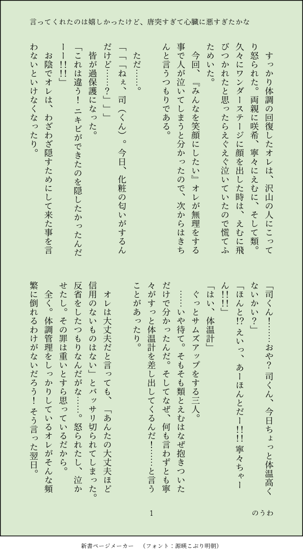 のうわ☆quiet followDONE先日の体調不良ネタの『ぶっ飛んだ』後日談類司でお送りします。前回の作品への沢山の反応、本当にありがとうございました!!泣いて喜びました。本当に嬉しかったです。・謎のハイテンションや行動力を含む・🎪が最早セコム・寝ぼけ眼のまま書いたので誤字脱字は見逃してやってください show all(+5 images) Tap to full screen (size:618x1132).Repost is prohibited Let's send reactions! freqpopularsnackothersPayment processing Replies from the creator Follow creator you care about!☆quiet follow のうわDONE題 「自覚はこれから」作者 のうわ(@nouwa__prsk)相互のふりーちゃんとプロット交換をして書いた作品です!テーマはこたつ。プロットをふりーが、本文をのうわが担当しました。Twitterのプロットと合わせてお楽しみください! 11 のうわDONE題 「あたたかいのは」作者 ふりー(@free86136383)※大人になった二人、同棲中相互のふりーちゃんとのプロット交換をして書いた作品です!テーマは「こたつ」プロットをのうわが、本文をふりーが担当しました。Twitterのプロットと合わせてお楽しみください! 9 のうわSPUR ME人型の猫🎈×🌟の過去編パートを載せて我が尻を叩きます!加筆修正もしてません!過去、親など色々捏造してます! 12154 のうわSPUR MEワンライで書こうとして終わらなかったネタのいま出来てるところまで出して尻叩きます🚨注意🌟が記憶喪失 7 のうわSPUR ME封印タグのお話尻叩き用(あらすじ)🎈が(モブ女との)結婚の報告をしてお祝いムードの中、🎈に十年以上も片思いをしていた🌟は……🚨注意🌟が最低【封印されたもの】・明るい雰囲気・優しさ・両思い・一人称(一人称の方がイメージが湧きやすかったので、とりあえず一人称で書きはじめました。後ほど三人称に書き換えます。)封印されたものから分かる通りのお話です。 4 のうわSPUR MEルツの日に間に合わず、🎈誕にも間に合わなかったやつも尻叩き🚨注意人型の猫🎈×人間🌟 9822 recommended works kani_developDONE👴👉👌🍶パスは🍶の誕生日 3 うたきDOODLE▲童猗窩 碳烤腰果煎饼DOODLE■保健室(郭嘉×广陵王)预警:扶他学院paro。 如题。 わるもぐらDONE2025年もよろしくお願い致します〜抜け殻描くの難し楽しかった〜 国府田かずやDOODLEじいちゃんと孫と子犬。 tatara_miyoSPUR ME可愛い部屋に囲まれて二階堂くんが監禁され快楽堕ちさせられる本描きたいですどこまでも君は可愛いよ。って何度も言われて身体に教え込まれて、こんな自分に欲情するやつがやばい→ヤバいやつだけど気持ちいいこと教えて貰えて嬉しい……♡くらいにまで落ちちゃうほんのり常識改変も入れたい玩具攻め結腸責め快楽堕ちドエロオンパレード、頭の悪い本になりそうです(絶対書くとは言ってない) nattannandesuyoDONE2025/1/12 コミックシティ大阪にて無料配布した杉月の小話です。パスは芋けんぴです。 6904 もっちのお部屋DOODLE寝ながらパン食べもっち。 まほろDONE2025カラム隊長バースデイを祝って。カラプラ婚約中。カラム隊長の誕生日を祝いたいプライド様が、レオン王子の協力をえて、アネモネでお忍びデートを計画する話。 13