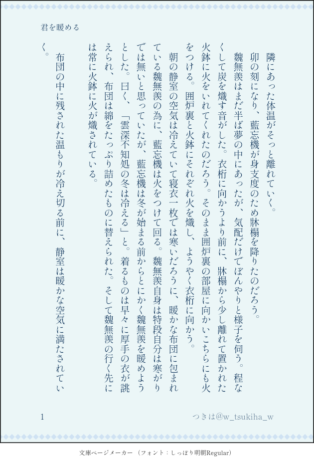 つきは☆quiet followDONE50話後、雲深不知処で暮らす知己のはなし。一緒の牀榻に寝てるけどまだ知己。 #cql #知己 knowOneself show all(+3 images) Tap to full screen (size:630x928).Repost is prohibited Let's send reactions! freqpopularsnackothersPayment processing Replies from the creator Follow creator you care about!☆quiet follow つきはDONE50話後、色々あって今は静室で暮らしている知己の話。暑い日が続く中、藍忘機が見逃したのは… 5 つきはDONE事後なので一応鍵にしてます。cqlで本編後、静室で暮らしながらなんやかんやあって知己越えてる2人です。18歳以上ですか? yes/no 2 つきはDONE50話後、雲深不知処で暮らす知己のはなし。一緒の牀榻に寝てるけどまだ知己。 4 つきはDOODLEcql、魏嬰テストを兼ねたらくがき つきはDONEcql、まだ知己50話後、静室で暮らしてる知己のとある日のはなし 3 related works 林 田DOODLEティーバッグ、抱き枕に続きスマホスタンドが発売とのことで、びっくりして画像を眺めていたら、もうこういう状態にしか見えなくなってきています。修真界のラシュモア、雲深不知処。 2 yahiro_niizawaMAIKING本日の進捗(金丹用に書いてるcql忘羨の転生現代AU)やっと忘羨がデートを……!そろそろ一度まとめてぴっしぶに投げようか思案中#忘羨 #mdzs #cql 3 林 田DOODLE姚宗主ネタ夏祭り2022 タグでtwitterに投稿したものです 林 田DOODLE田中抱山ふ美子って言いたさが8割 林 田DONE闇ティーバッグで潤う姑蘇 松風水月の叔父上の席の後ろの衝立のパネルヒーター感がすごいです 2 林 田DONEかおる子さんのSNS初心者沢蕪君が好きで、三次創作させていただきました。https://twitter.com/kaoruko_mdzs/status/1561935393380978688?s=21&t=EUOO5WeUfiO-bSAcaKSJlg 林 田DOODLE姚宗主ネタ夏祭り2022 タグでtwitterに投稿したものです 林 田DOODLEいわゆる酔っぱ藍湛というやつだと思います。(※トレスで、こいつら100%伝説のパロディです) 林 田DOODLE平和な世界のグラサンコーデバトルです recommended works pfvnvavcTRAINING沸き上がる情熱に負けて初めて魏嬰さん描いた。いい加減だし、めちゃくちゃ修正して汚いから薄目で💦どうしても魔道祖師ではなく陳情令で描きたい。三次元を二次元でかわいく描きたいのだけど、こればかりはひたすら描いて慣れるしかないのかな。あ、アナログしか出来ませぬぬぬ。藍湛さんも役者さんも描きたい❗練習記録になるかな❓ habe٩( ᐛ )وPROGRESS頑張って描くよ! 2 林 田DONEかおる子さんのSNS初心者沢蕪君が好きで、三次創作させていただきました。https://twitter.com/kaoruko_mdzs/status/1561935393380978688?s=21&t=EUOO5WeUfiO-bSAcaKSJlg 林 田DOODLE秣陵で放送されているcql47話は蘇渉vs仙子がワイプで入るらしいぞという絵。(※ワイプが入るシーンは本当は江澄vs阿瑶らへんなので間違ってます) 林 田DOODLE季節の絵です🎃 渋谷にも来てくれると思います。 藤次郎DONE魏嬰✨🐰✨ も²@time1010thiefDOODLECQL5話の彩衣鎮前泊妄想ネタ⚠️沢蕪君と江澄の描き分けが出来なかったので()あにそし変換でお届けしています。あのメンツでなんで忘羨が同室だったのか🙄忘羨部分がちっこいコマになっちゃったので拡大したやつもオマケでぺたり 2 くろあんハミデターノDONE'23/09/25up cql「魏無羨は腹が痛い」知己距離の近さがバグってる知己です! 4 くろあんハミデターノDONE24/10/31up 魏嬰誕生日おめでとう🎉
