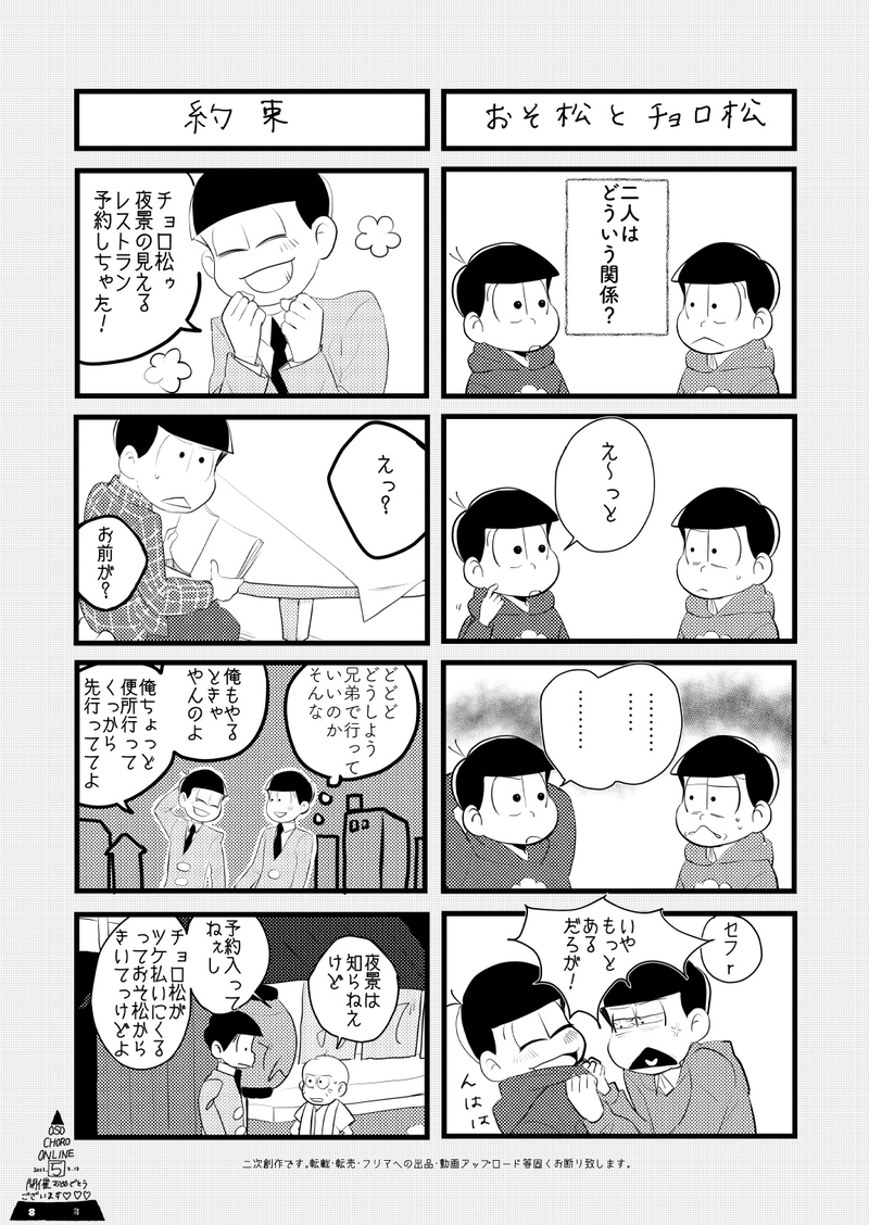 當天傍晚一松還是跟カラ松回到房間,經過今天的事情後,總算是心情上也放鬆了下來,當一松打開浴室的門時,就看到カラ松不知道什麼時候已經搶先進去浴室,而且也不知道為什麼泡著澡還戴著墨鏡,而浴缸裡的玫瑰花瓣也不知道他從哪裡找來的,總而言之就是很痛……
