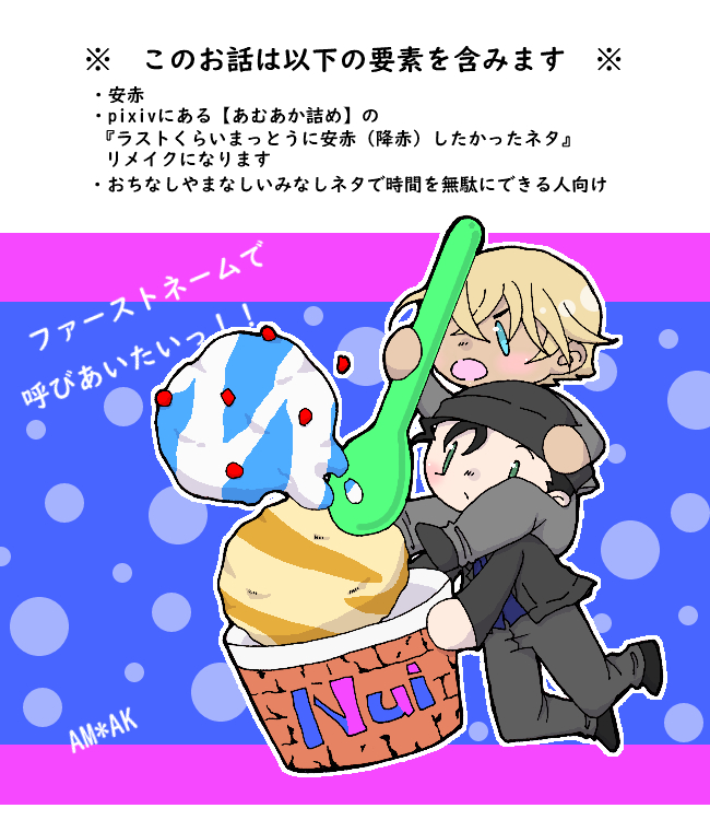 ろみじあ☆quiet followDONEシクトリ9で展示していた小ネタになります。ファーストネームで呼びあいたいふるやくんが奮闘する(?)安赤小ネタとアイス店で働くおきやさんの安沖小ネタ。沢山見ていただいてありがとうございました! #シクトリ9 #安赤 show all(+6 images) Tap to full screen (size:650x750).Repost is prohibited Let's send reactions! freqpopularsnackothersPayment processing Replies from the creator Follow creator you care about!☆quiet follow ろみじあDONE【となりにいるかもしれぬい】まとめました今思うとタイトルがホラーっぽいw 9 ろみじあDOODLE某所で2025年3月末から4月頭まで毎日一枚ずつ流していたまんまるまとめですまんまるAMAK週間はもともと一枚絵なので最終日の一枚のみ入れましたキャラまるまるしてます…注意? 8 ろみじあDONEシクトリ9で展示していた小ネタになります。ファーストネームで呼びあいたいふるやくんが奮闘する(?)安赤小ネタとアイス店で働くおきやさんの安沖小ネタ。沢山見ていただいてありがとうございました! 7 ろみじあDONE【4月18日追加】 9 ろみじあDONE『とあるふるあかさんちのてでいさん』2023年分まとめです。降赤前提ですが、メインはテデ&ぬいの疑似家族日常ほのぼの小ネタ。今回は小さじ程度の降赤成分ありです。 20 ろみじあDONEこちら、テディ愛6プレゼント企画のキーワード置き場でした。回答期間が過ぎたので差分のお祝い絵に差し替えました~(11月8日追記) related works genso_akasyuDOODLE弊アカウントの両方声出るタイプの二人です安赤 genso_akasyuMOURNING裏垢作って流してたやつ※入ってません 3 mikavivaDOODLEシャワールームで着衣というのが好物です。 junMOURNING🐈⬛の日(盛大に遅刻) yorihitoDOODLEチソチソ輪投げする安赤女体化18歳以上かつIQ3以下ですか?(yes/no)おっぱい。ゲームはまだ始まってません。 2 akinobu707amakDONE久々の一人暮らし赤井~~~ ろみじあMAIKING2021年バレンタインあむあか(というよりあむおき)小ネタ。急遽思いついて描き出したものの、間に合わなかったので中途半端に放り投げときます。あむくんの肌の色とか、トーン的なものとかまったく処理されてません。ペン入れて取り込んだほぼそのまま。文字も手書きで読みにくい。(2月15日追記)おきさんのハイネックと変声機の存在が消えてる!(頭から抜け落ちてた)ごめんなさい…! 4 genso_akasyuDONE安赤よしセッ多分前もこんなの描いたろうけどサビなのでまた描く サクラコDOODLEこの後全力で謝った。