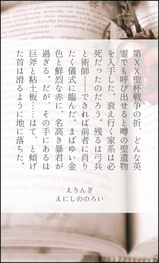 えりんぎ☆quiet followMOURNING4年前のSSS。どこにも出す機会がないので供養。人理修復後、危険因子としてバラされ触媒となったぐだ♂を取り戻しに行く鯖。術ギルぐだ♂とエドぐだ♂です #エドぐだ♂ #術ギルぐだ♂ show all(+1 images) Tap to full screen (size:550x910).Repost is prohibited Let's send reactions! freqpopularsnackothersPayment processing Replies from the creator Follow creator you care about!☆quiet follow えりんぎDONE「MEDiUM」より庭画。エ□本に翻弄される画家のギャグ。脳みそ空っぽで読めます。 3 えりんぎREHABILI「MEDiUM」の庭師と画家それぞれの酒ネタ。1枚目画家Side/2~3枚目庭師Side。直接描写はありませんが画家が身売りをしているので苦手な方は注意⚠ 3 えりんぎDONEDiD2のED後。ここから始まるテオリク小話。 2 えりんぎDONEDiDネタでテオ×リクター。テオがドクター、リクターがラボ生まれのホムンクルス。捏造妄想幻覚1000%のためご注意ください。 4 えりんぎDONE「MEDiUM」の庭師と画家によるソファ攻防戦。カプ描写はありませんが、距離感のバグった二人がいます。 3 えりんぎDONEŹOOĻ記念日2024「What You Want」で本編開始前の錬金術師の話。「ある助手の独白」の錬金術師視点。 (カプ表現はありませんが生産元は助手×錬金術師思考です) 2 related works えりんぎMOURNING4年前のSSS。どこにも出す機会がないので供養。人理修復後、危険因子としてバラされ触媒となったぐだ♂を取り戻しに行く鯖。術ギルぐだ♂とエドぐだ♂です 2