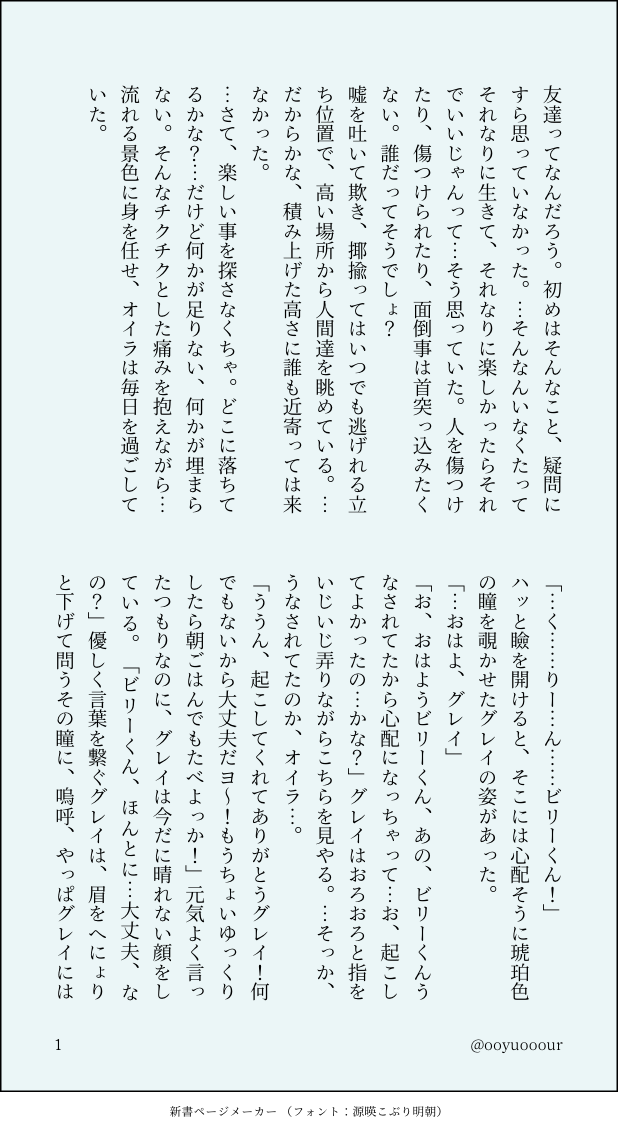 ooyuooour☆quiet followDONE🍬🧁で友情話(八章後) #ビリグレ bigotry show all(+2 images) Tap to full screen (size:618x1132).Repost is prohibited Let's send reactions! freqpopularsnackothersPayment processing Replies from the creator Follow creator you care about!☆quiet follow ooyuooourDONE🍬🧁で、10年後のビリーと入れ替わる話 2256 ooyuooourDONE🍬🧁アイス 2 ooyuooourDONE🍗🧁妖しい悪魔 2 ooyuooourDONE🍬🧁ドルパロ 4 ooyuooourDONE🍬🧁で友情話(八章後) 3 ooyuooourDONE🍬🧁ぬいぐるみ 3 related works 庵(iho_io_iho)DONE多分同棲してる。無防備🧁ちゃん。⚠ビリグレ♀⚠女体化 robin01275DOODLEビリグレ 蕩けちゃう話 R18みが強いので注意 パスワードはグレ 849 ooyuooourDOODLEビリグレ前提のジェトグレ🧁がトラウマ抱えてる 4 ゆかしたMEMO好きなのはお互い変わらないけど愛し方が違ったビリグレがすったもんだする妄想早口(ツリーまとめ) 2123 robin01275DOODLEビリグレ ヘアアレンジ 1160 よどみDONE(※ちょっとだけ流血・欠損)空の色(ビリグレ)こないだの描きかけ完結させました。 6 ooyuooourDOODLEモブグレからのビリグレ 6 ooyuooourDONE🍬🧁で、10年後のビリーと入れ替わる話 2256 かも🦆DOODLE寝ている彼とアイマスク (ビリグレ)昨日の特別配信2部のネタバレ?あり。付き合ってるビリグレです。ちょっと可愛らしいお話にしてみました。短いです。 1368 recommended works ooyuooourDOODLE🍬🧁準備 3 ゆかしたDONEおたおめ!!! wk_gsrPROGRESS現在のアシュグレ(付き合ってないというか無自覚状態)がごつサブで五年後の世界に飛ばされて、付き合ってるというかもはや結婚してるアシュグレと出会ってすったもんだする軽めのギャグ話にしようとしたけど思ったよりシリアス方向に舵を切ってしまったためいつ仕上がるかわからなくなったのでとりあえず一回進捗上げとこうみたいなそういうあれ。未来アッシュはまだ出てきてない。 5139 029_ga_0141MAIKINGマフィアパロなアシュグレ。小さい頃の二人。 3498 u_yasagiDOODLE安心してください!見えてないですよ!!(ナニが)大事な部分を上手く隠したエロくないエロ絵。というか、リハビリがてららくがきしたけど服を描くのが(もういい)。二枚目は差分です。頬染めるだけで若干いかがわしさがUPした。 2 シトロンDOODLEえち練習 5 _tannbo_24DOODLE払えるのかい!払えないのかい!!どっちなんだい!!!!!!!!もう金貰えるなら割と何でもするようになってしまっている万年金欠ギャンブラー獪♀と獪♀に金さえ払えば割と何でもしてくれることにハマってしまった善の地獄のエロ日常 さわらDOODLEアグ 半地下PAST烏月夜 烏詠以前Twitterにアップしていたお話。事後の匂わせがありますが、🔞なシーンはないです😂想像力で補完してください💪 3