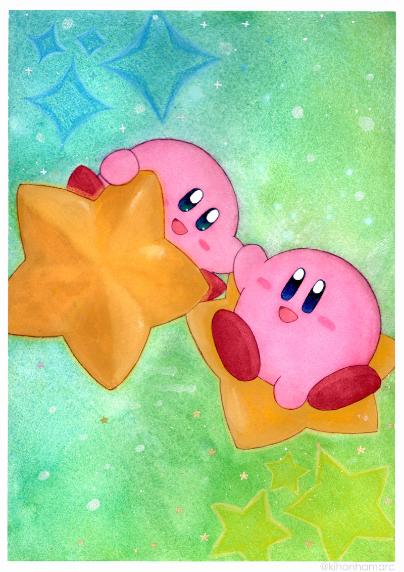 星のカービィ33周年記念です、前景のマスキングに染み込んだ絵具を不透明水彩と色鉛筆でなんとかした為水彩塗りに厚塗りのワープスターが共存しました