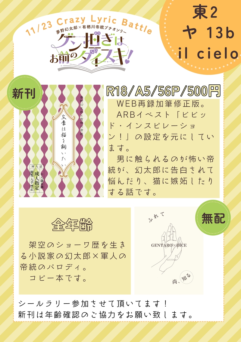 11/23 CrazyLyricBattle31 幻帝プチ「ゲン担ぎはお前のダイスキ!」に参加させていただきます。web再録ですが、ページ換算で7p分加筆&修正版です。サンプルはぶつ切りです。