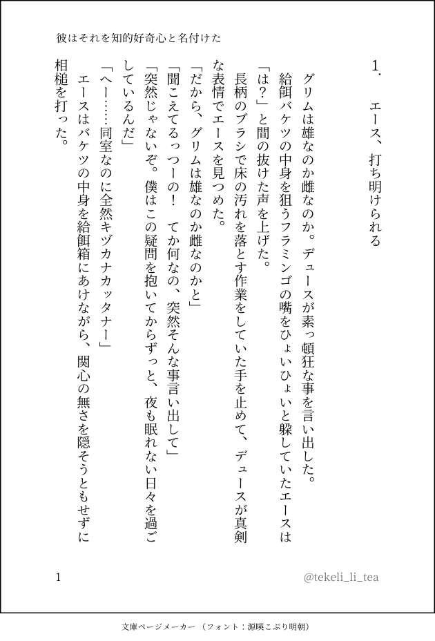 燈台守☆quiet followDONE20210225 読み返したら説明不足が目立っていたので追記修正。修正箇所:グリタマを巡るデュースの発言、地の文の細かな表現。エース+デュースのアホな下ネタ話。二人がグリムの◯◯の話をするだけ。多分続く。ちょいちょい捏造設定あり。設定資料集でグリムの頁を初めて見た時、まずこう思ったよね。 ##twst show all(+8 images) Tap to full screen (size:630x928).Repost is prohibited Let's send reactions! freqpopularsnackothersPayment processing Replies from the creator Follow creator you care about!☆quiet follow 燈台守DOODLE一人と一匹の共同生活が始まったばかりの頃のオンボロ寮。 燈台守DONE下ネタ要素が消失した第7話。ギャグで始めたつもりがホラーに着地しそう。あれだけ黒い石食ってれば多少はね、というわけでグリムの体に異変が出る描写あり。互いにクソデカ感情を向け合うオンボロ寮を目指しました。 11 燈台守DONEアホな下ネタ話の第6話。ジェネリック猫たんを吸っていたイデアのもとへ、エース+デュース+オルトがやって来る。悪ノリする時だけ息ぴったりだと可愛いよね。陰の者へのバックアタックはお控えください。動物園でフラッシュを焚くのと同じくらいギルティです。 15 燈台守DONEアホな下ネタ話第5話。エース+デュース+オルトが図書室と廊下でわちゃわちゃする回。ちょいちょい捏造有り。PSバレも。 11 燈台守DONEアホな下ネタ話第4話。デュース+ラギーが図書室で駄弁る回。真面目で要領悪いと割り切れずに損する事多いよね。 11 燈台守DONEエース+デュースのアホな下ネタ話。第3話。リドルくんのやさしい後輩指導。 15 recommended works ぽめ🌞💎DOODLEなんか描いておかないと…って気になった ばるるんDOODLE石新を思案 6 fumiTRAINING ハギモリDOODLEべったり あーにゃんDOODLECOC「ireako-イリーコ-」KP:あーにゃんPL:MJさん林堂くんのSAN値を回復させてきました。元気になってくれてありがとう〜〜! 花咲まめDOODLE厚塗り練習③ 00tennn___DOODLEとんさに 3p sketches!! 3 ichigoichinoDOODLE久々なので練習 ちゃむDONE天使の日!