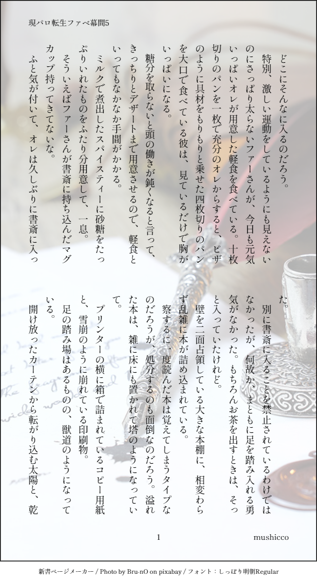 mushiccoVer2☆quiet followDOODLE【現パロ転生ファベ・幕間5】ふぁべ。恋の明確な自覚と失望。あまりにぐちゃぐちゃすぎてすべてなかったことになるかもしれないですがご容赦ください。 show all(+3 images) Tap to full screen (size:618x1132).Repost is prohibited Let's send reactions! freqpopularsnackothersPayment processing Replies from the creator Follow creator you care about!☆quiet follow mushiccoVer2DOODLE9月1日に発行するファーベリのアンソロジーの私の本文です。26頁 約17000字/すけべ有ファベノケンカから始まるベリアルの拾い食いと、ベリアルの拾い食いを許さないファーさんのおはなしです。※サンプル 1222 mushiccoVer2DOODLE気が向いたら修正していく感じの(ジャギジャギの草稿なので減ったり増えたり消えたり修正してまったく違う話しになったりします) 6118 mushiccoVer2DOODLE【12月18日全空24 発行:ファーベリ新刊告知】※.あくまでもサンプルのため、修正がはいっているものもあります。 8 mushiccoVer2TRAINING22年5月の新刊[冒頭]研究所時代のファーさんとベリアルの日常と、ベリアルとサリエルのちょっとだけ非日常のウェットなおはなし。ようやっとメンテナンスを終えて解放された、ある夜のサリエル。疲労したからだで自分の部屋に帰る最中、ふと人気のない研究所内に〝補佐官〟の気配に気づく。気配の濃さに異常を感じたサリエルは、急いで彼がいるはずの元に向かった。向かった先には、所長が。 20212 mushiccoVer2REHABILI【2022/10/16開催ふわおりWEBオンリー:ファーストキスはりんごのかおり】夏の新刊からキスにまつわる掌編2本(計5頁)再録しました。 5 mushiccoVer2REHABILI【2022/10/16開催ふわおりWEBオンリー:ファーストキスはりんごのかおり】付き合っていると思っていた不破さん×オレはファーさんのこと好きだけど付き合ってないもんねと思ってる織部のはなし(表紙除き計12枚)(画像が読みにくい人向け: https://privatter.net/p/9398757) 13 recommended works Few__2516DOODLEStanxeno18⬆️ yes/no 4 井倉めじかDOODLE😡😈(クリアル) ぱすたDOODLE膾羊クリスマス 2 流星(なかれぼし)DOODLEメリークリスマス🎄🥳クリスマスのラクガキなんとか間に合ってよかった〜今回なシアちゃんと泉くんの2人です⭐︎ ai_mituhanaPAST今年は新規絵あげられないと思うので過去絵を供養 kiaki7_mrfDONE大丈夫、泣かないで。雪が降ったらまた会えるからね。その時はまた一緒に遊ぼうね。 sqx2aDONE 2 reoyou25PASTウィーウィッシュアメリクリスマス!!!!ウィーウィッシュアメリクリスマス!!!!(シャミくんの過去絵) 2 winwynneDOODLE